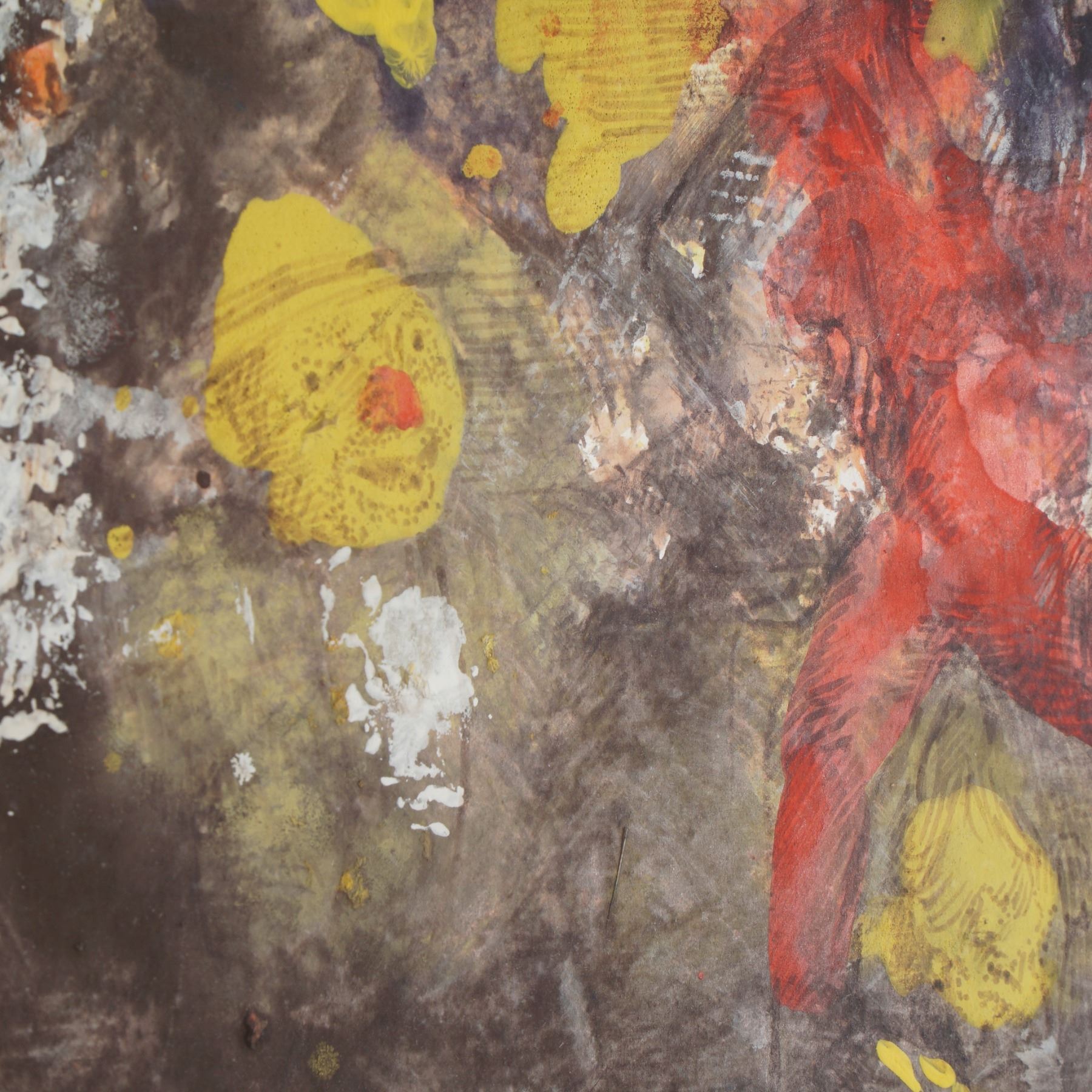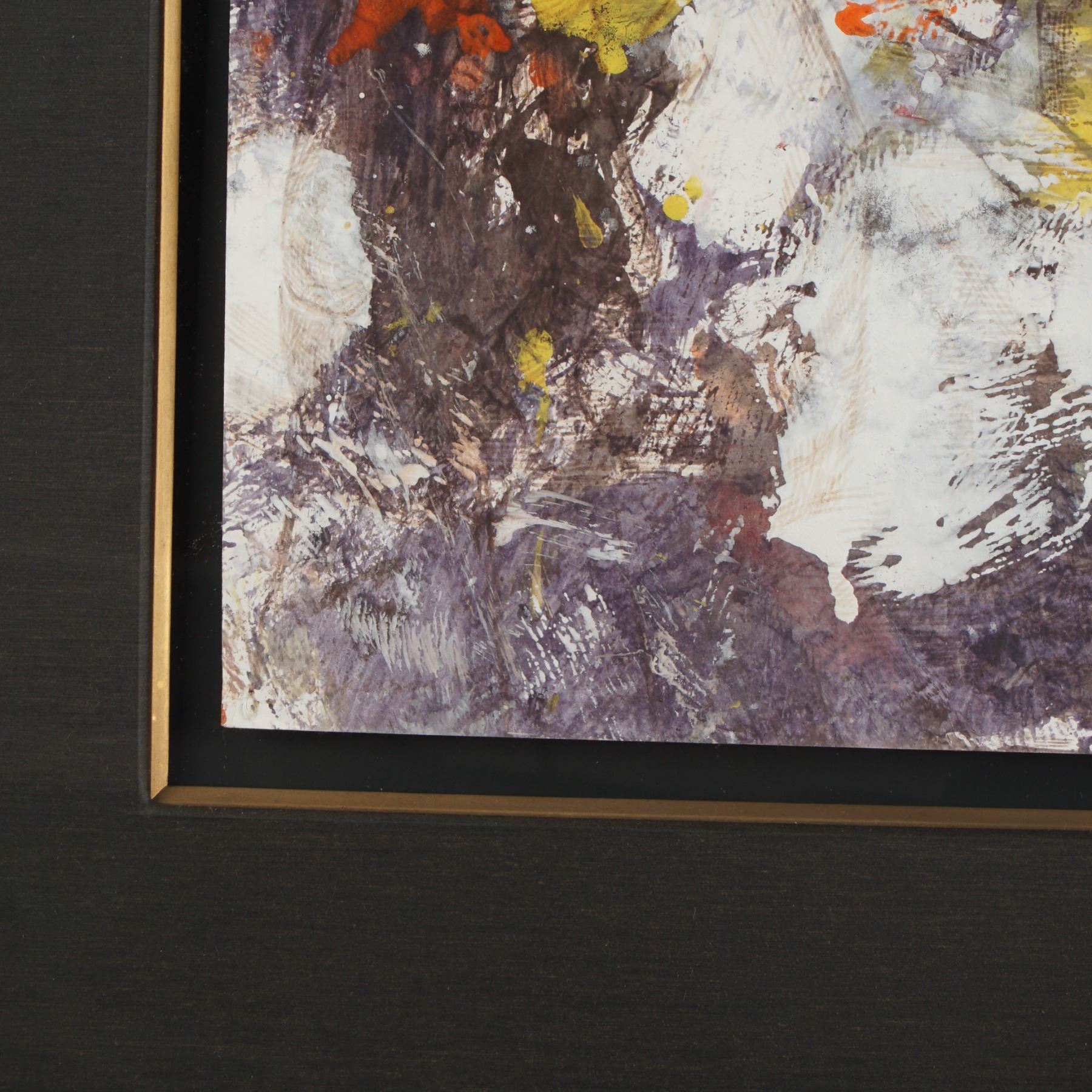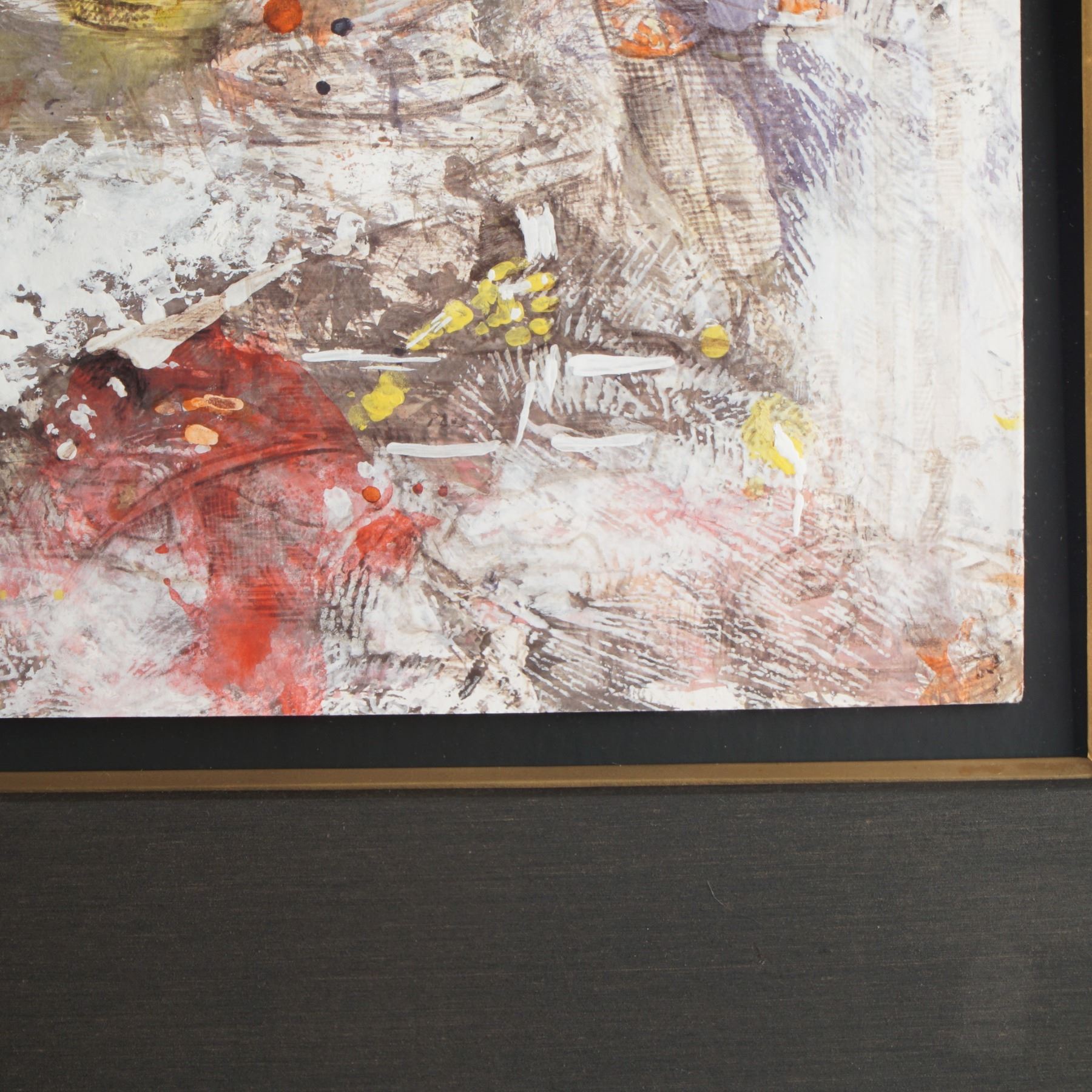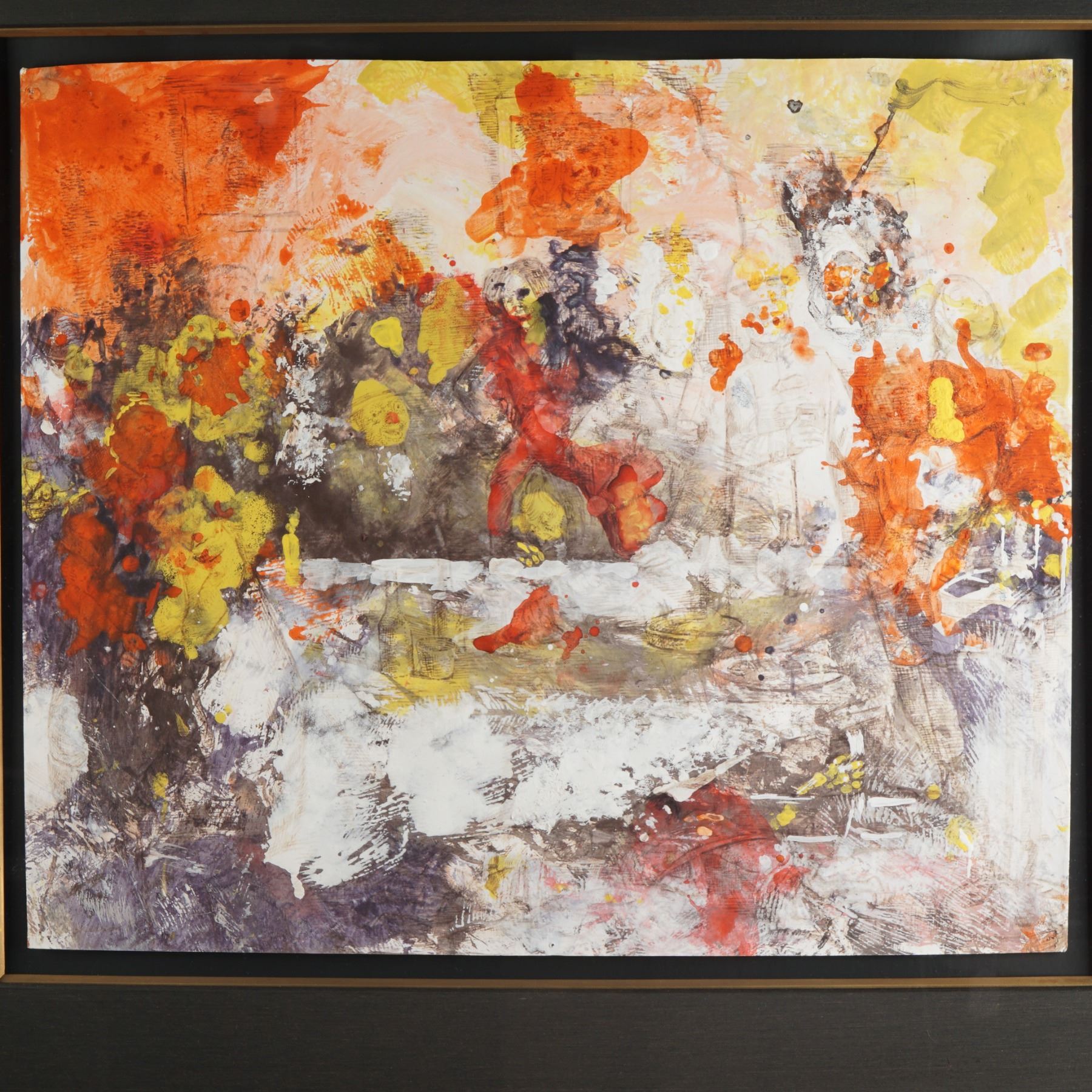 Dynamic abstract watercolor painting on paper by Josef Jackerson, mounted under glass in a black and gold-accented frame. The composition features a vivid interplay of expressive color and form, blending rich autumnal hues of orange, yellow, and red with energetic brushwork and layered textures. The work exhibits a raw gestural quality, reflecting Jackerson's affinity for organic abstraction and emotive chromatics. This piece showcases Jackerson's skill in balancing chaos and harmony, with hints of figurative suggestion embedded within abstract motifs. Josef Jackerson is an accomplished painter known for his vibrant abstract compositions and emotive technique. Born in Russia and later relocating to Israel, Jackerson developed a distinctive artistic voice influenced by both Eastern European expressionism and Middle Eastern vibrancy. His works have been exhibited internationally and are held in private and institutional collections. Jackerson's practice spans painting and graphic arts, with a focus on intuitive mark-making and color harmony.