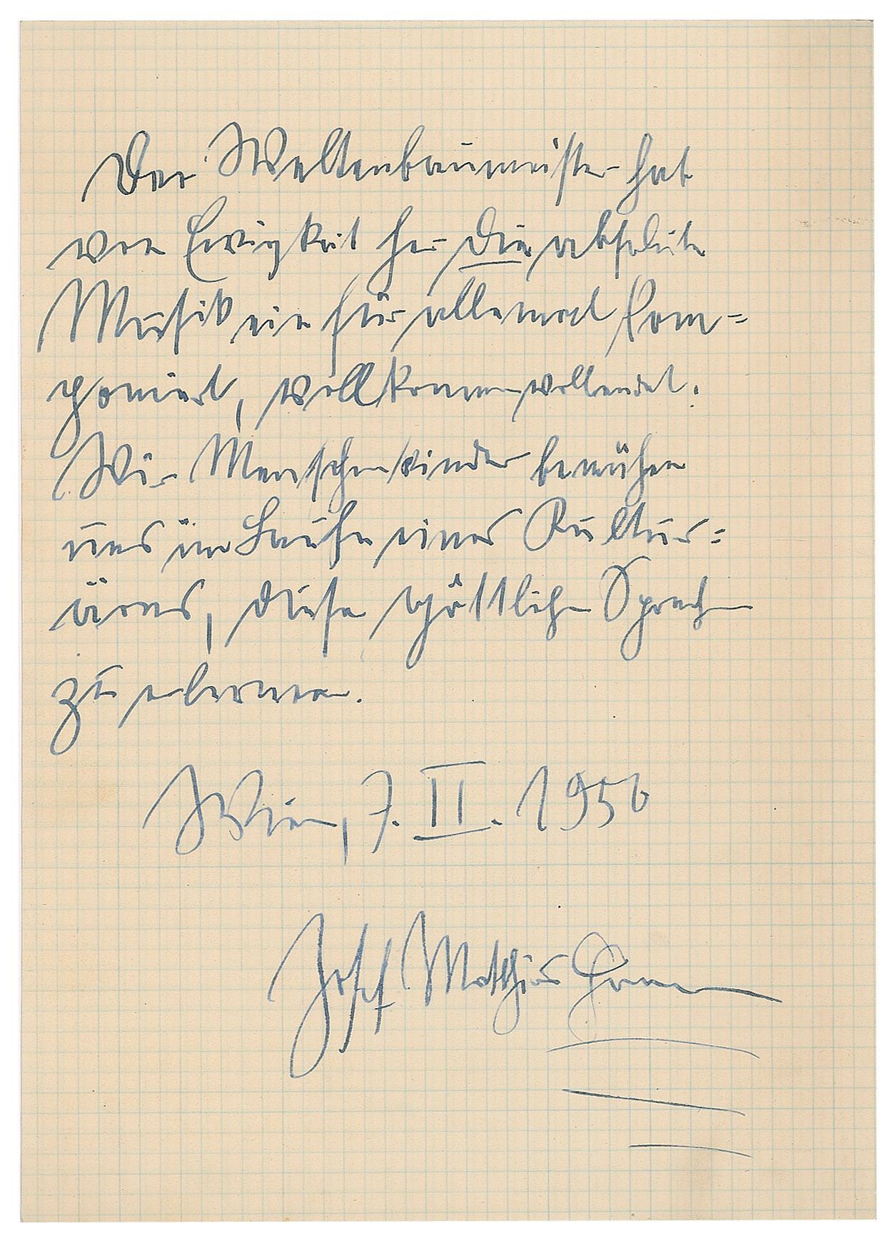 Austrian composer and music theorist (1883–1959) who, independently of and prior to Schoenberg, developed a method for composing with the twelve notes of the chromatic scale. AQS in German, one page, 8.25 x 11.5, February 7, 1956. Hauer writes, in full (translated): "The master builder of the world—has from eternity composed the absolute music once and for all, perfect, perfect. We human children strive to learn this divine language in the course of a cultural era." In fine condition.