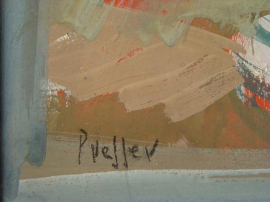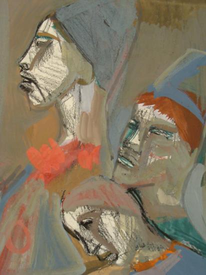 This is an original mixed media work by Josef Presser. The subject here is three figures, all wearing some type of hat or headpiece. The faces are white, catching the light in their individuals gazes, while their bodies are muted colors, blending into the background. Artist: Josef PresserTitle: "Untitled private work"Medium: Mixed media on paperSigned: In paint "Presser" lower leftImage size: 11" x 14"Condition: ExcellentFraming: Triple matted in white, black, and ivory, old painted wood frameFrame size: 24 1/4" x 29 1/4"This is a terrific original Presser piece, for anyone who appreciates this fine artist. BiographyJosef Presser (1907-1967) was born Lublin Poland. At the age of 12 he came to Boston, Massachusetts, and received a scholarship to the Boston Museum of Fine Arts. He was recognized as a boy genius at school, where he spent four years. After graduating, he traveled and studied in Europe, always with a sketchbook in hand. Upon returning to the U.S., he set up a studio in New York City, and later married and moved to Woodstock, NY, becoming member of the Maverick Artist Colony. His work has been exhibited at various institutions, including the Carnegie Institute in Pittsburgh, The Art Institute of Chicago, and the Metropolitan Museum of Art in New York. Josef Presser spent his last 3 years living and working in Paris. He became an Honorary member of Cercle Litte raire et Artistique, Bruxelles, Belgium. Presser's art can be found in many public and private collections throughout the world.
