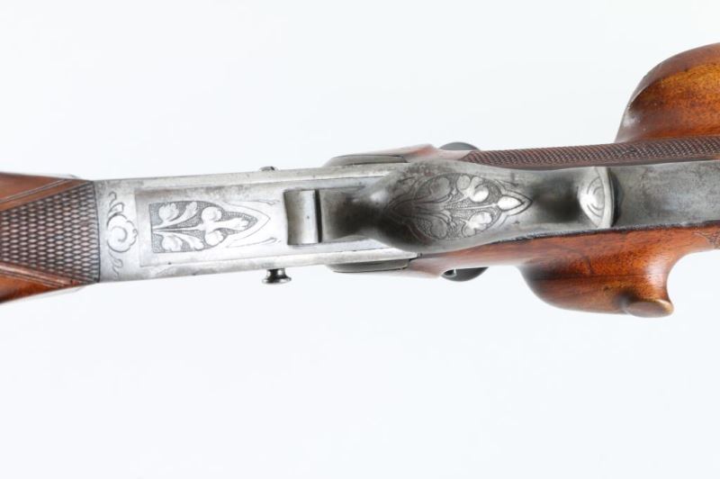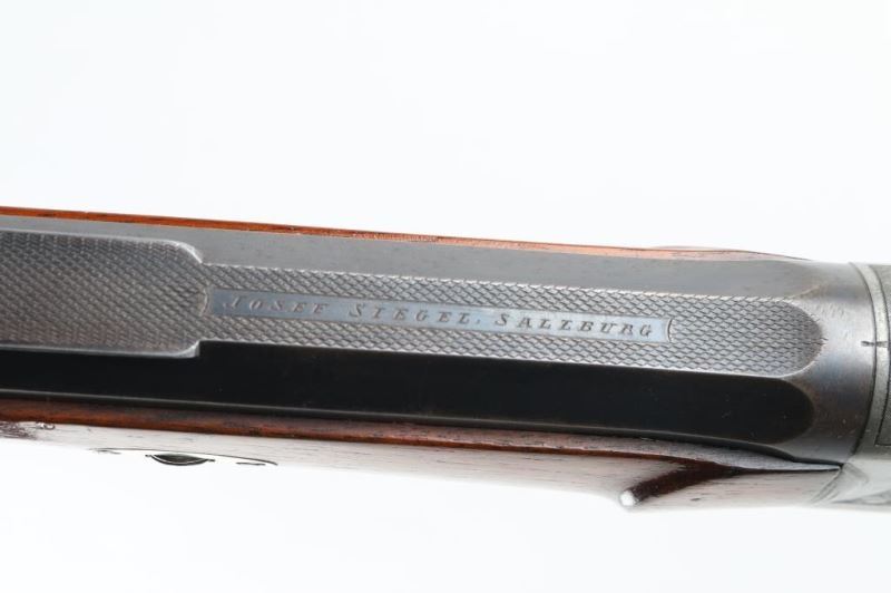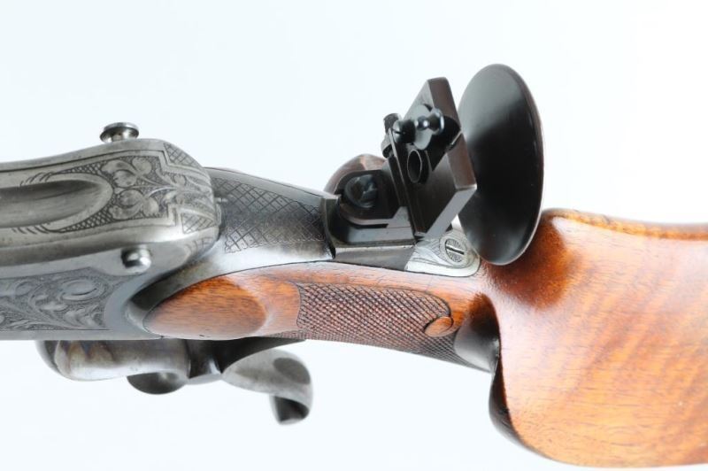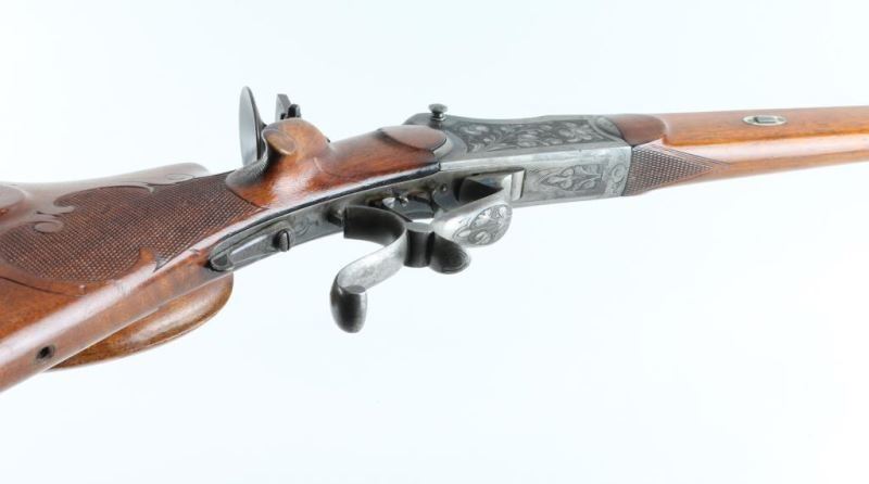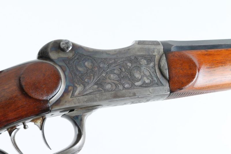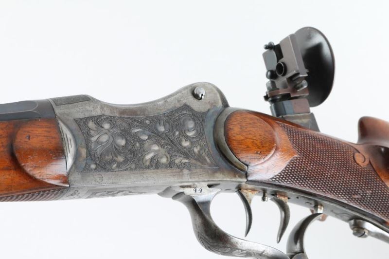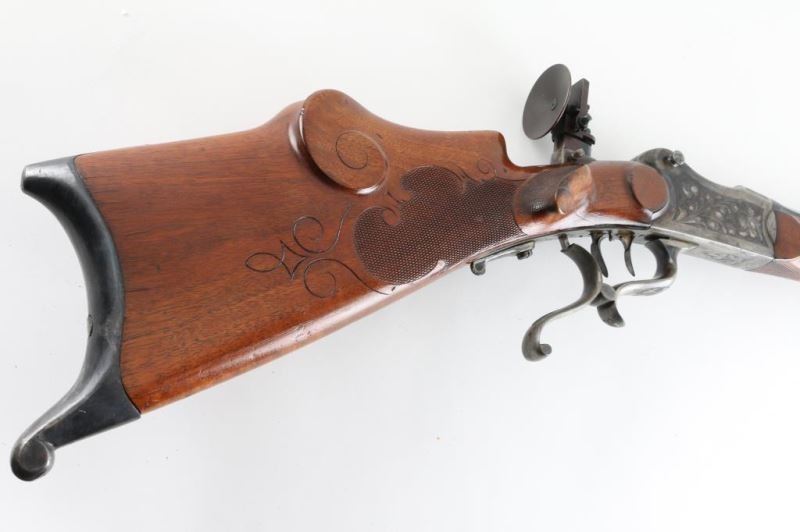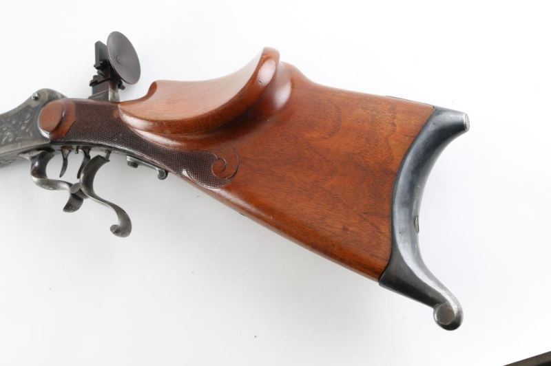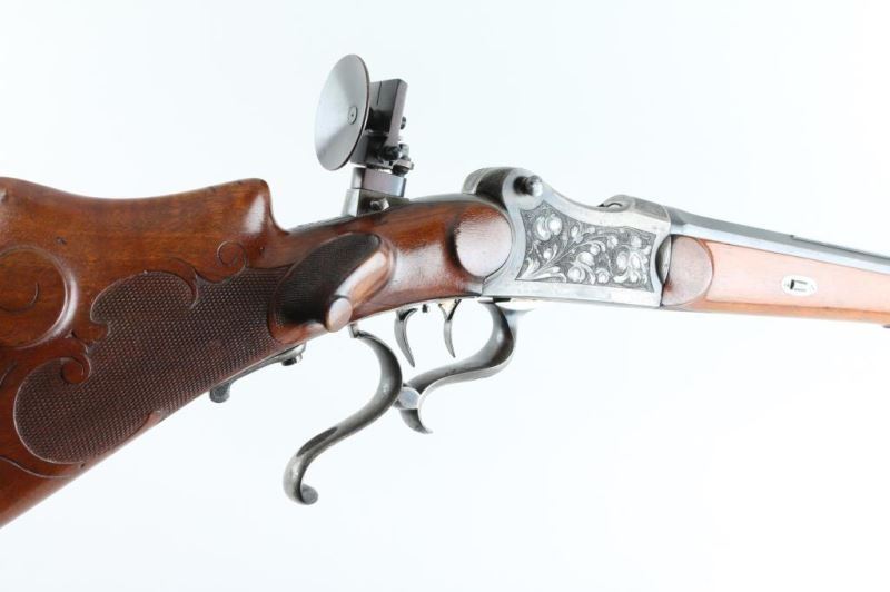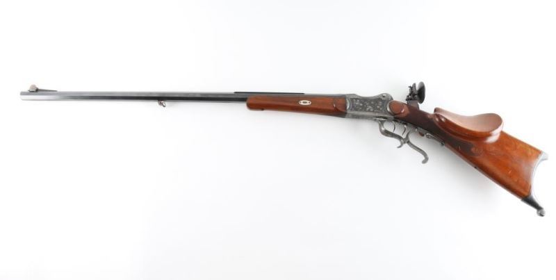 'Schutzen' type single shot rifle features 30" octagon barrel, dovetail section on barrel (for scope mounting), narrow swivel mounted under barrel, protected blade front sight, tang mounted peep rear sight, double set triggers, Schutzen type buttplate. Bore is very good condition. Barrel retains 85% blue, with scratches and edge losses. Action is case color, with some bright blue, mostly a grayish color. Floral scroll engraving covers 60% of receiver sides, top & bottom of receiver and underside of lever. Forend is very good condition with small checkered panel on bottom. Buttstock has checkered panels on sides of wrist, with fancy oversized cheekpiece for right handed shooter, and matching smaller checkered thumb rest on right side for shooter's hand. Hole in bottom of stock where rear swivel was removed. Condition is NRA Very Good *** Modern Firearm ***