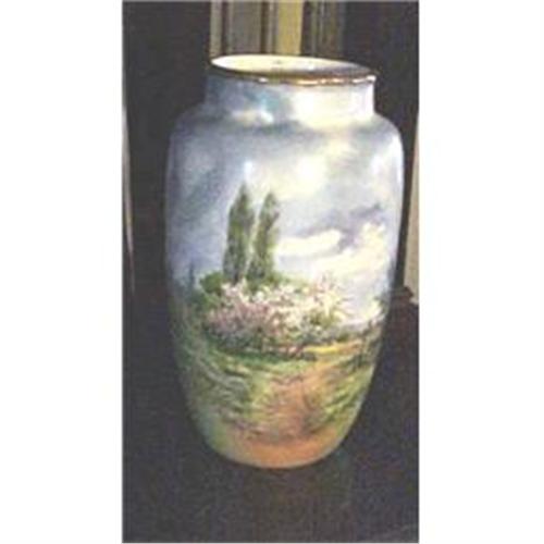 This is a lovely scenic vase by Josef Strnact of Austria. It was made around 1900. The vase is 8 1/2" tall with a full scenic panel that covers both the front and back. The front shows a cherry tree in full blossem backed by Cypress trees. The back shows several tiny figures walking along a tree lined path. The puffy cloud filled sky is shown on both sides. The vase is signed JS in the shield mark and 7903. The condition is very good with some slight loss of gold at the top rim. This is a lovely chic decorative object. Perfect for Spring flowers.