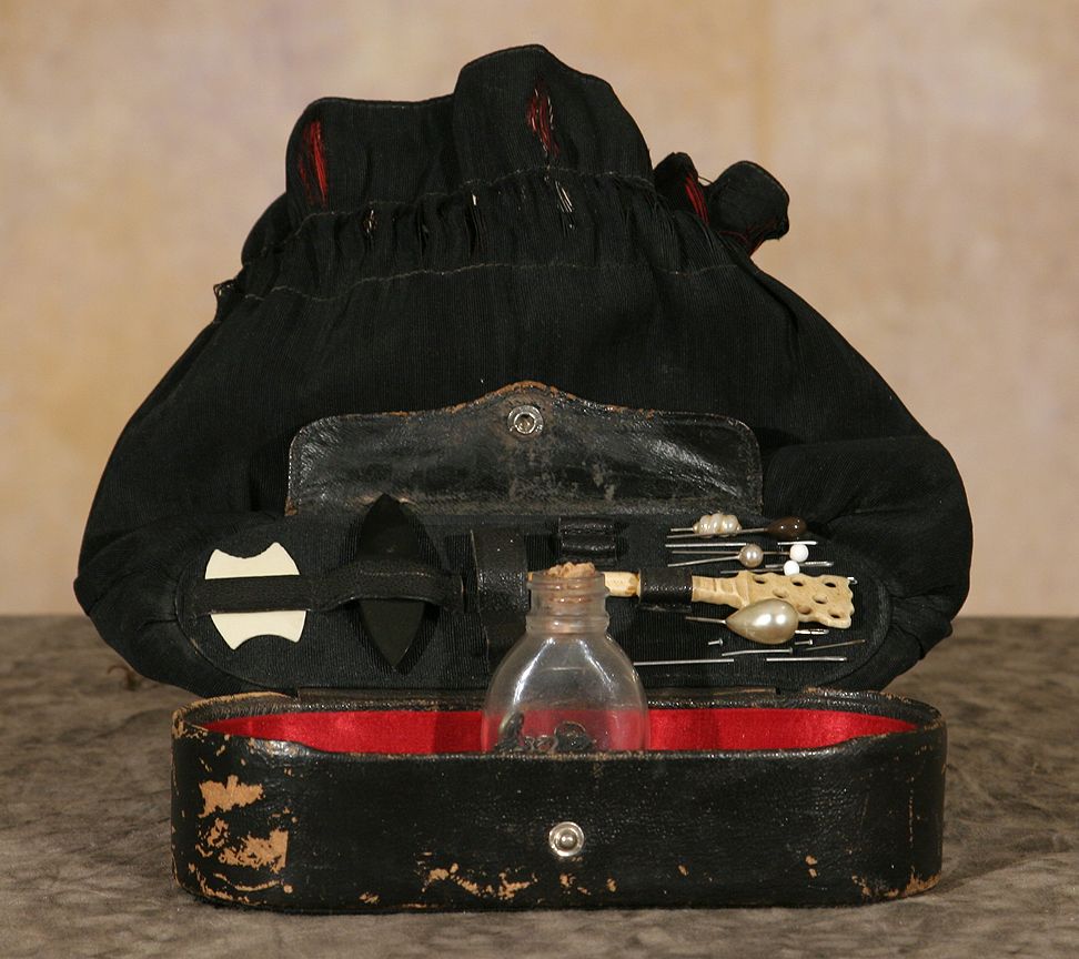 Josefa Carson's Sewing Kit. 7" x 2 ¾" leather sewing box with red silk lining and an attached 7" pouch. The box contains several sewing tools with bone or ivory handles. Josefa Carson (1828-1868) was Kit Carson's wife. They wed in 1843 and had eight children together. (est. $6,000-9,000). Provenance: Josepha Carson (1828-1868), by descent to his son "Kit" Carson II (1858-1929), by decent to his daughter Nettie Guadalupe Carson (1905-?), by sale to Ralph Meyers (1885-1948), by descent to his wife Rowena Meyers Martinez (1909-2000), by descent to her son Ouray Meyers (b. 1941). CONDITION REPORTS: www.auctioninsantafe.com/docs/cr2012.pdf