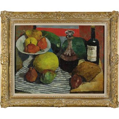 <B>JOSEP MARÃA MALLOL SUAZO </B></I>(Spanish 1910-1986)<BR><I>Bodegón</B></I>, circa 1950<BR>Oil on canvas<BR>19-3/4 x 25-1/2 inches (50.2 x 64.8 cm)<BR>Signed lower left <I>Mallol Suazo</B></I><BR> Paper labels on verso for: <I>Marcos, Petritxol, 8 / 1950</B></I>; and <I>Sala</B></I> <I>Parés - Barcelona - Petritxol, 5 / October 1960 / Registro E.M.S.A. / 11369</B></I><BR> <BR>Provenance:<BR>Sala Parés - Barcelona - Petritxol, 5, October 1960;<BR>Private collection<B>Condition Report:</B> Normal wear commensurate with age, relined<BR><BR><b>Shipping:</b> Requires 3rd Party Shipping (<a target="_blank" href="http://www.heritageauctions.com/common/shipping.php">view shipping information</a>)