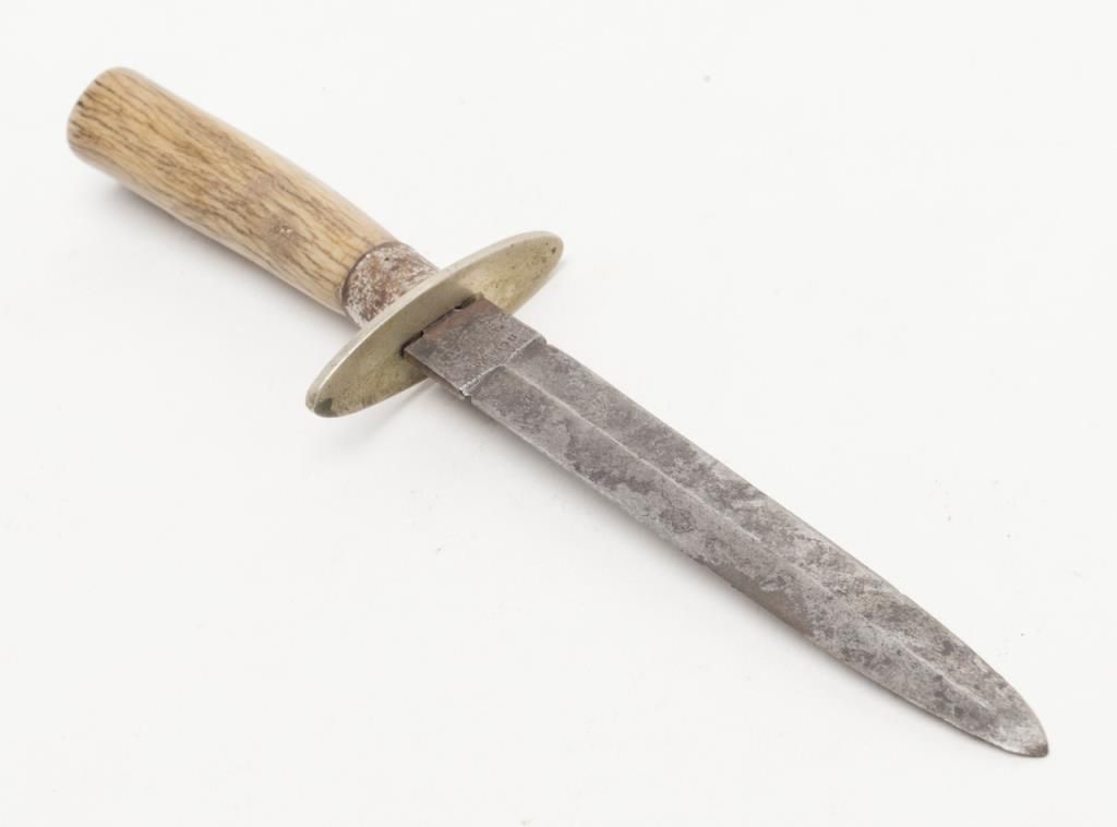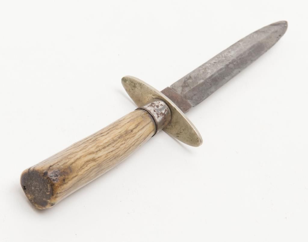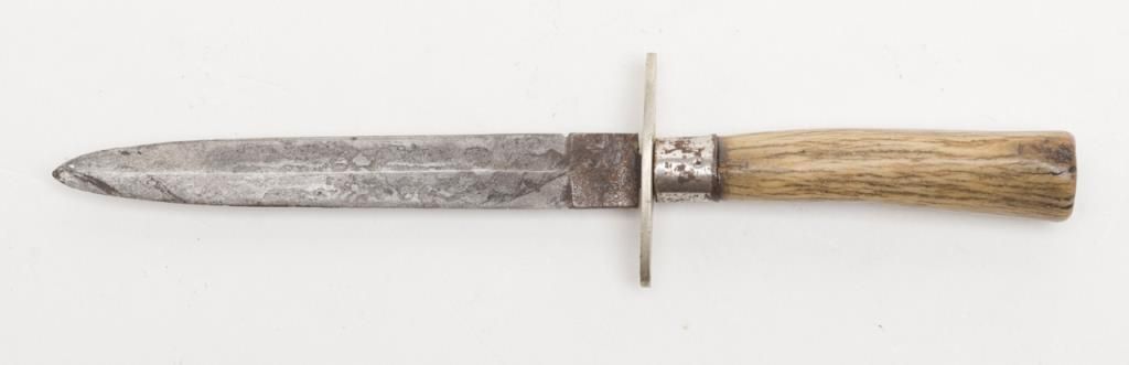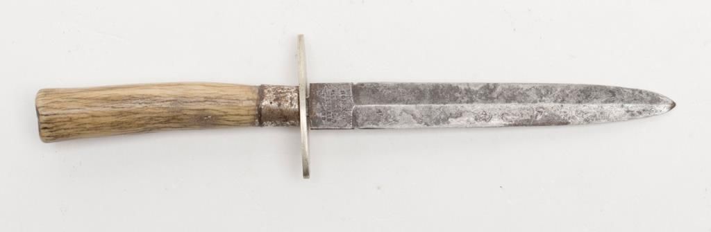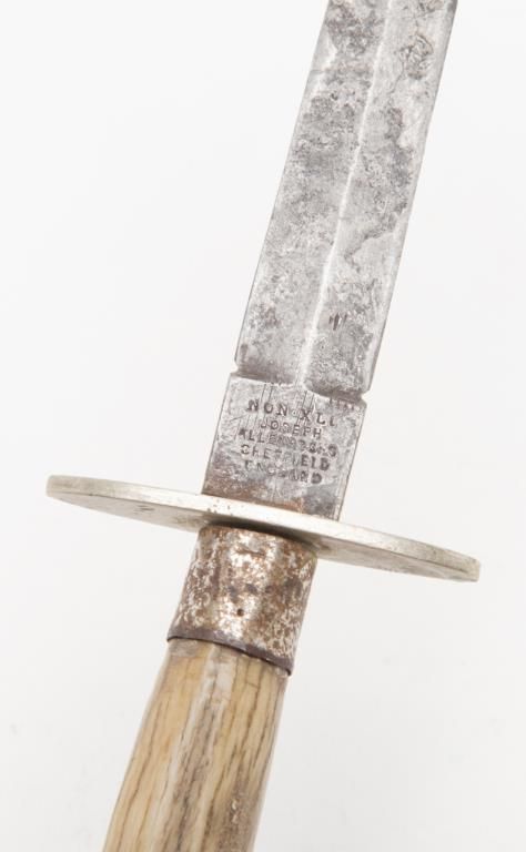 Joseph Allen & Sons Non-XL spear point dirk size knife with stage grip, approx. 7-1/2” overall with 4-1/4” blade showing scattered areas of erosion, simple cross guard, good grip. Est.: $150-$300.