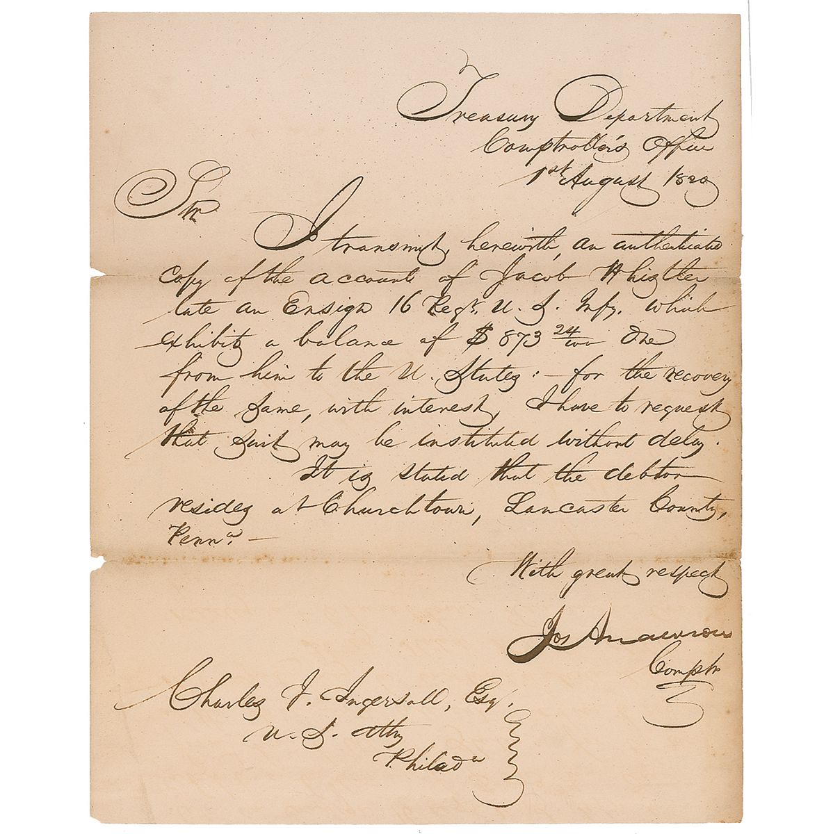 Soldier, judge, and politician (1757–1837) who served as a United States Senator from Tennessee from 1799 to 1815, and later as the first Comptroller of the United States Treasury. LS signed “Jos. Anderson,” one page, 8 x 9.75, August 1, 1820. Anderson writes to US Attorney, Charles J. Ingersall, Esq., from the Comptroller’s Office of the Treasury Department, in full: “I transmit herewith an authenticated copy of the account of Jacob A. Listler, late an Ensign 16 Regt. U. S. Mfy. which exhibits a balance of $873.24. One from him to the U. States: for the recovery of the same, with interest, I have requested that first may be instituted without delay. It is stated that the debt resides at Churchtown, Lancaster County, Penna.” In very good condition, with scattered creasing and toning, two small areas of paper loss to the left edge, and old tape repairs to folds on the reverse.