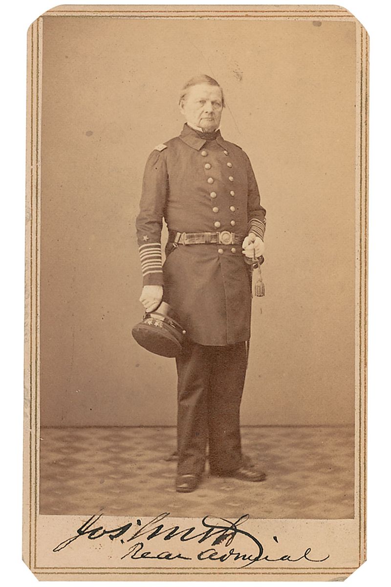 US naval officer (1826–1862) who was killed in action while in acting-command of the USS Congress when she was destroyed by the Confederate ironclad CSS Virginia. Rare original 2.25 x 4 carte-de-visite full-length portrait of Smith in uniform, signed in the lower border in black ink, “Jos. Smith, Rear Admiral.” Published by Gardner of Washington. In fine condition, with clipped corners (not affecting the image or signature).