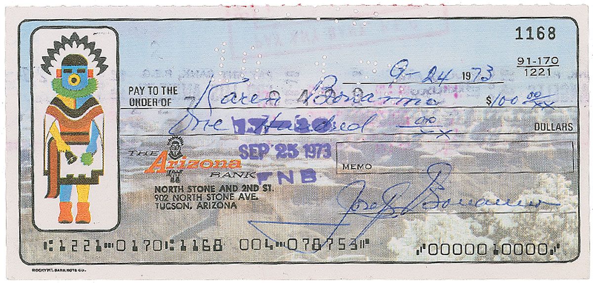 Personal check, 6 x 2.75, filled out and signed by Bonanno, payable to Karen Bonanno for $100.00, September 24, 1973. In fine condition, with expected cancellation holes and stamps, none affecting the clean signature area. Accompanied by a certificate of authenticity signed by Bonanno’s daughter-in-law, Rosalie Bonanno.
