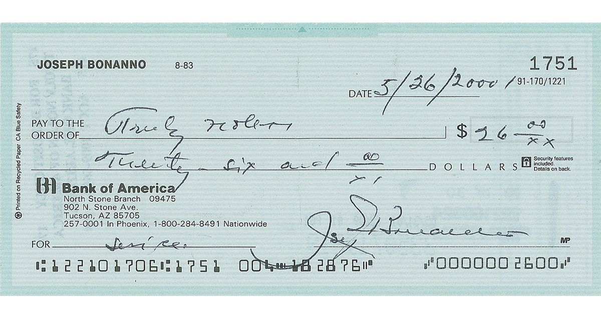 Personal check, 6 x 2.75, filled out and signed by Bonanno, made payable for $26, May 26, 2000. In fine condition.