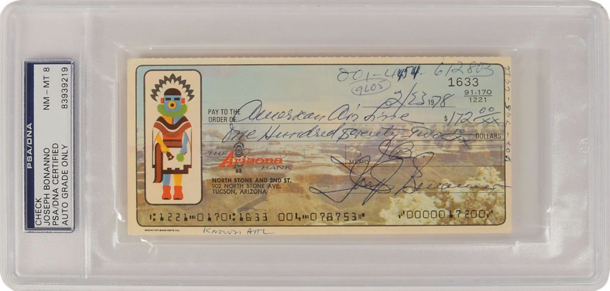 Check, 6 x 2.75, filled out and signed by Bonanno, payable to American Airline for $172, February 23, 1978. Bonanno adds a series of account numbers and notations to the borders. Encapsulated in a plastic PSA/DNA authentication holder. In fine condition.