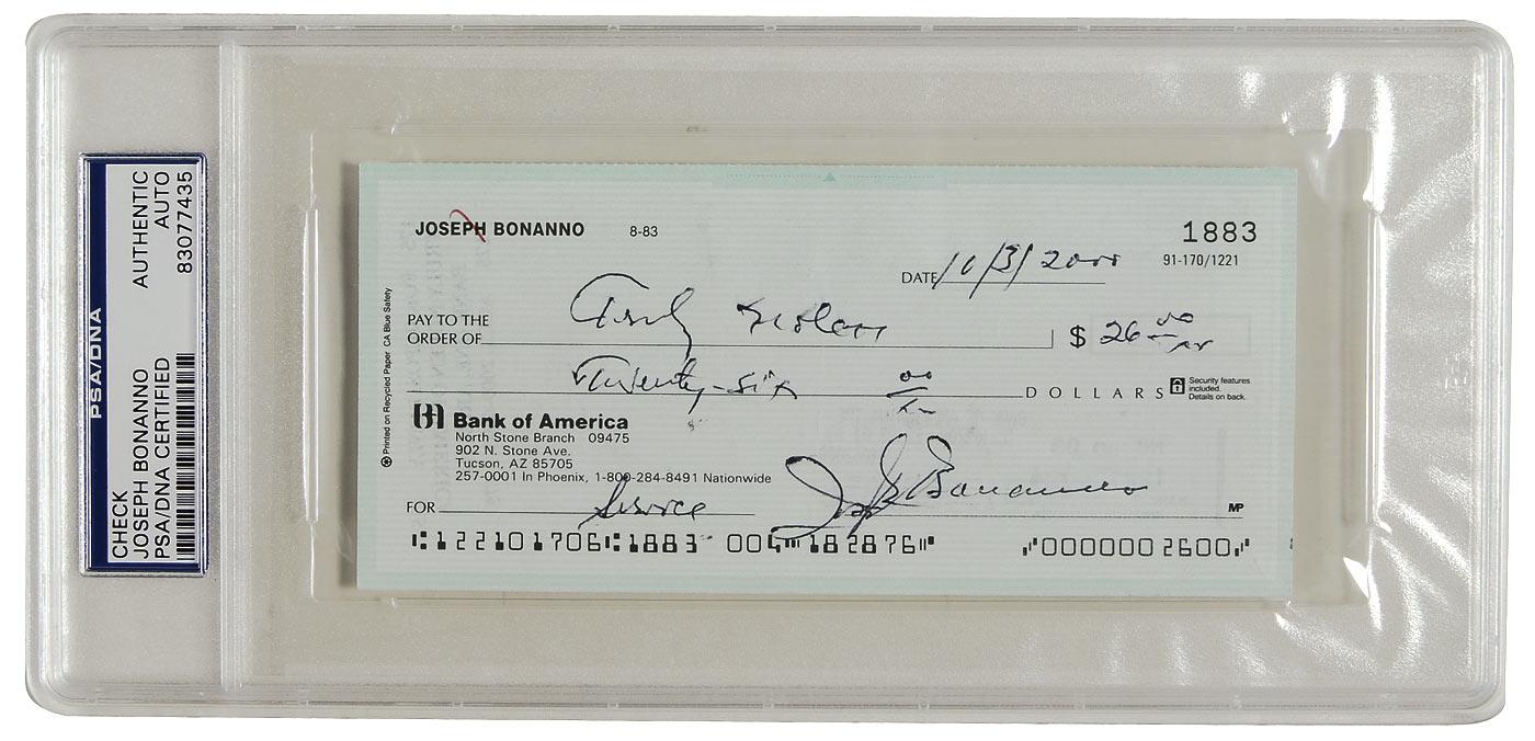 Personal check, 6 x 3, filled out and signed by Bonanno, payable to Truly Nolen for $26.00, October 3, 2000. Encapsulated in a plastic PSA/DNA authentication holder. In fine condition, with light creasing and show-through from cancellation stamp on the reverse. RRAuction COA.