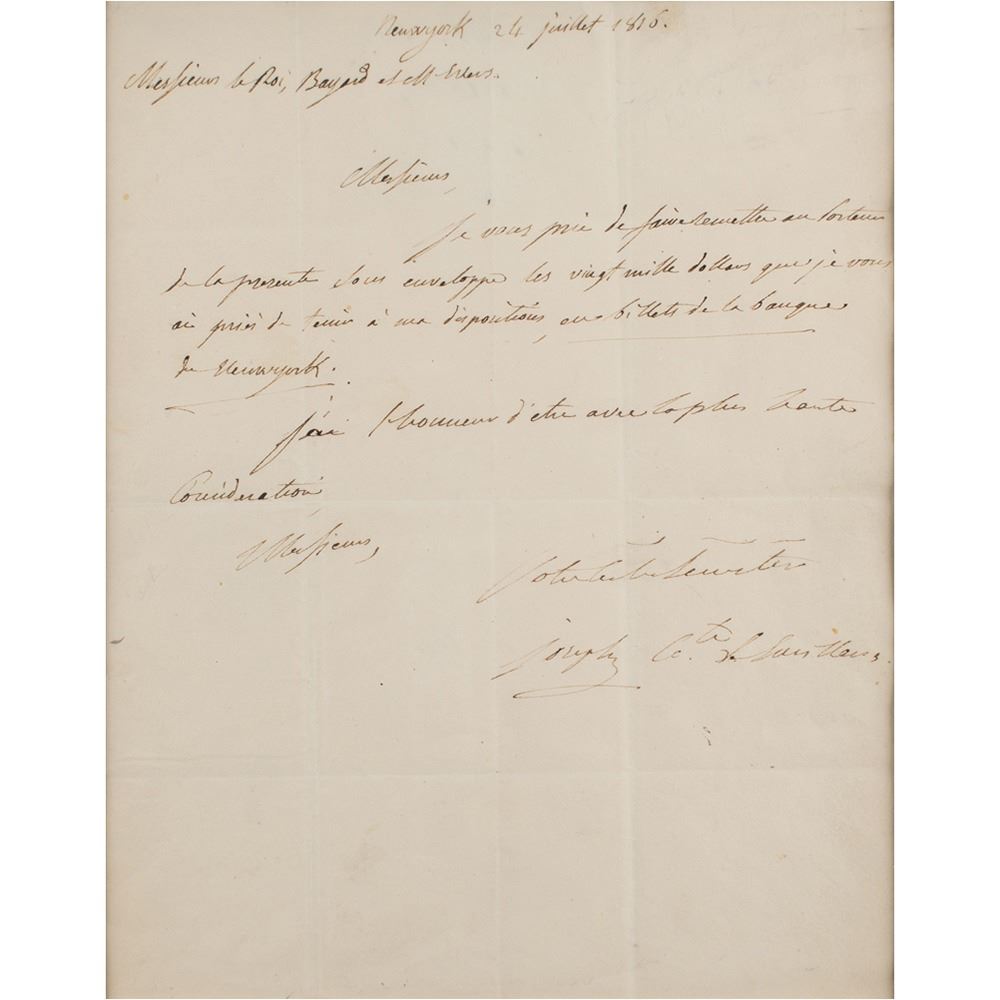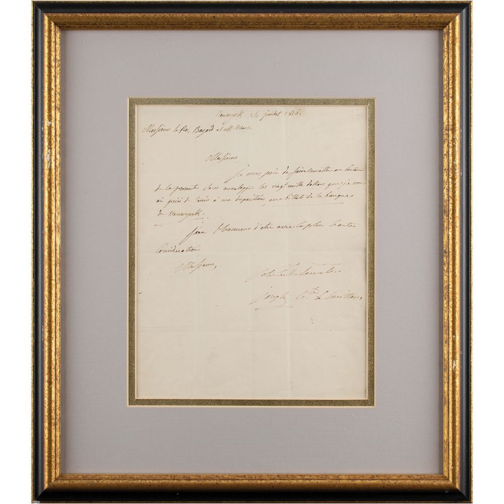 ALS in French, signed “Joseph Cte. de Survilliers,” one page, 7.5 x 9.75, July 24, 1816. Untranslated letter written from New York. Double-matted and framed to an overall size of 14.5 x 16.5. In fine condition, with multiple intersecting folds.