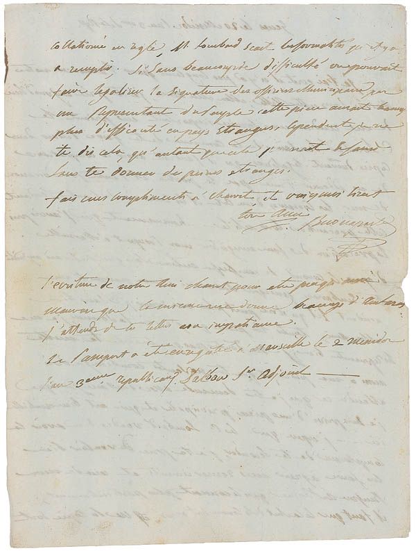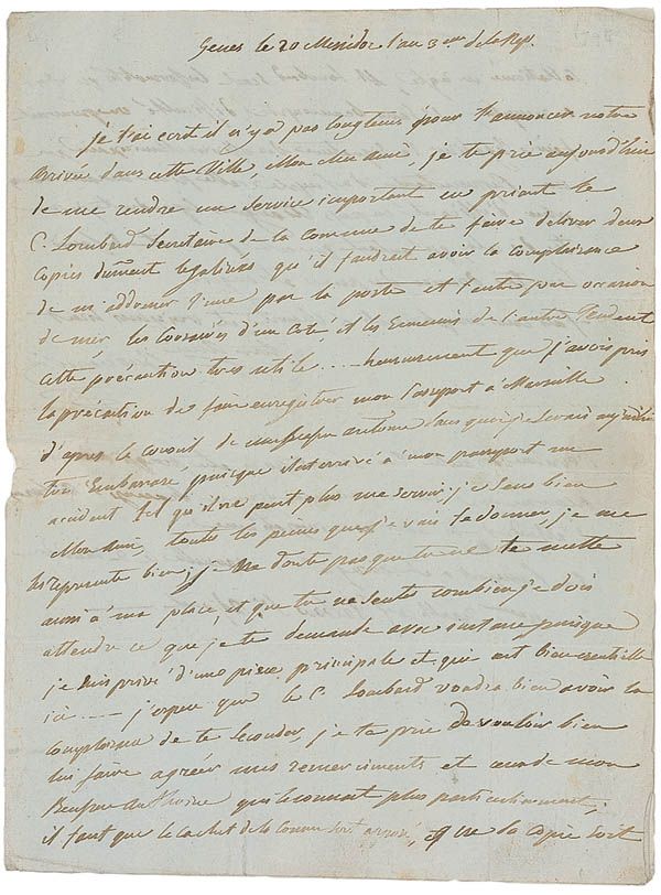 Older brother of Napoleon; King of Spain (1808–1813) and of Naples (1806–1808). ALS in French, signed “Buonaparte,” one page both sides, 7.25 x 10, July 8, 1795. Letter to Citizen Rey, Commissioner of War, Marseilles. A humble request for a replacement to a passport lost in Marseilles due to "an unavoidable accident." Buonaparte desires two copies of the passport to be given to his brother-in-law as "neither the sea nor the land is safe." Reverse of second integral page bears an address panel in another hand with remnants of the embossed seal. In very good condition, with intersecting folds, scattered creases and wrinkles, paper loss to second page from wax seal, and scattered toning.