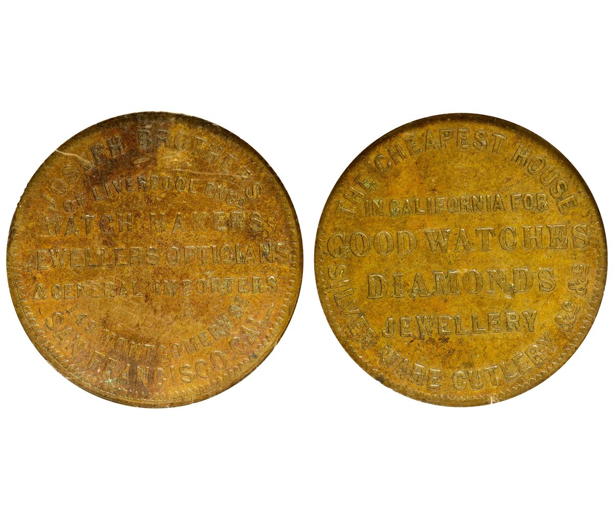 1850 - Holed at top center. Obverse: Jospeh Brothers/Of Liverpool Eng/Watch Maker`s/Jewellers Opticians/& General Importers/149 Montgomerys`/San Francisco Cal//Reverse: The Chea. . .[holed] St House/In California For/Good Watches/Diamonds/Jewellery/Silver Ware Cutlery & c. K1277 Kappen. Condition: heavily pitted. -61242