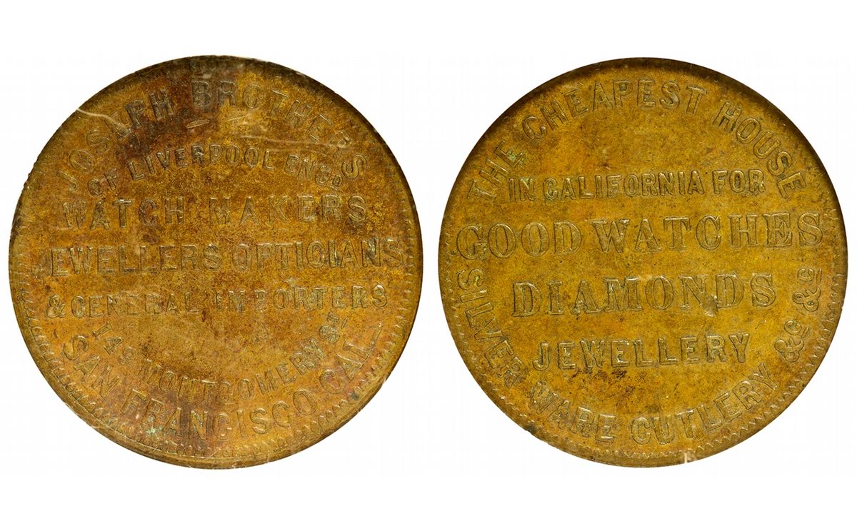 c1850 Holed at top center. Obverse: Jospeh Brothers/Of Liverpool Eng/Watch Maker`s/Jewellers Opticians/& General Importers/607 Montgomerys`/San Francisco Cal. Reverse: The Cheapest House/In California For/Good Watches/Diamonds/Jewellery/Silver Ware Cutlery & c. K1277 Kappen. Condition: AU 55 BN. - HKA#66198