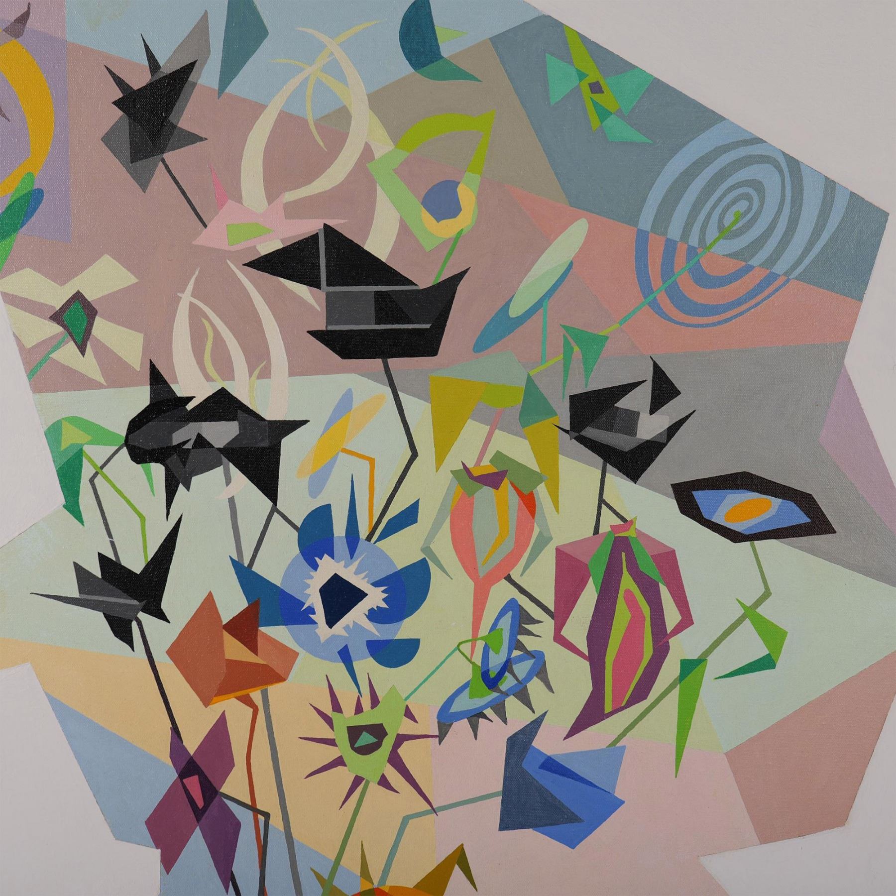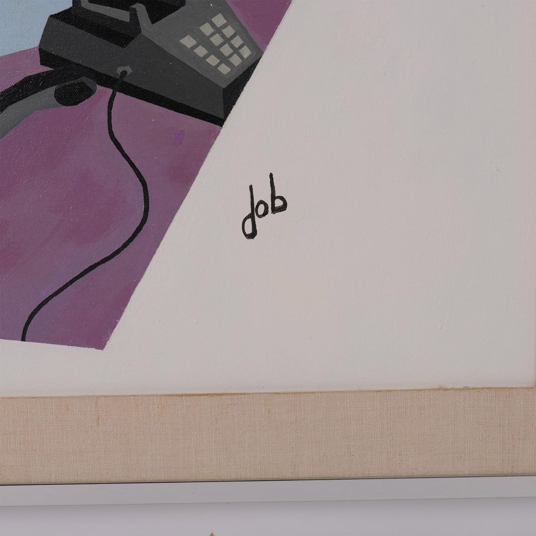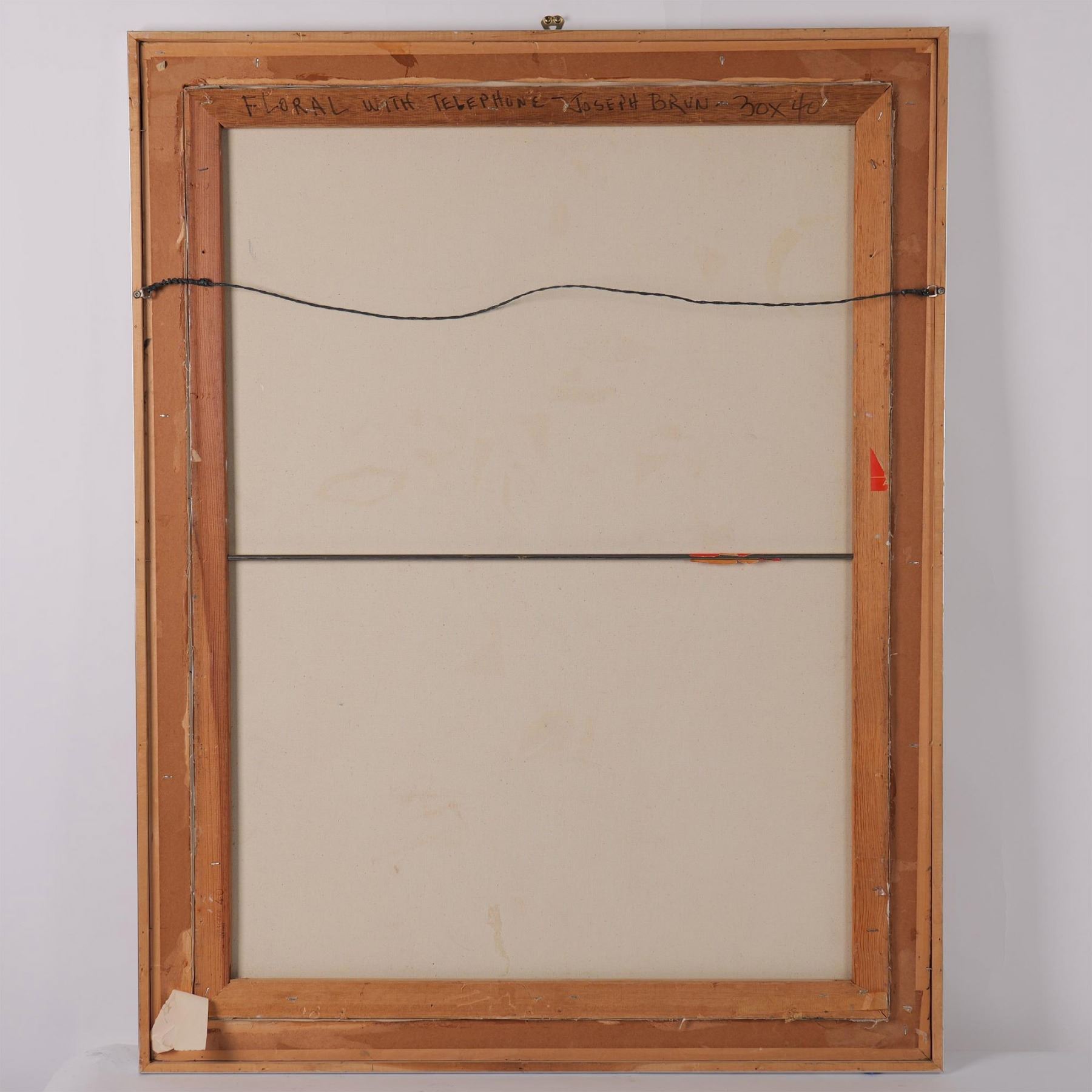 Original oil on canvas entitled Floral and Telephone by Florida based artist Joseph Brun. He paints a bouquet of flowers by a phone that he places on a geometric surface that seemingly appears as a collage of soothing colors. Signature on lower right: Job. Title and signature on verso: Floral with Telephone, Joseph Brun. Housed in a metallic frame with an ecru linen border. Artwork dimensions: 30"L x 40"H. Frame dimensions: 34.75"L x 44.75"H x 1"W.