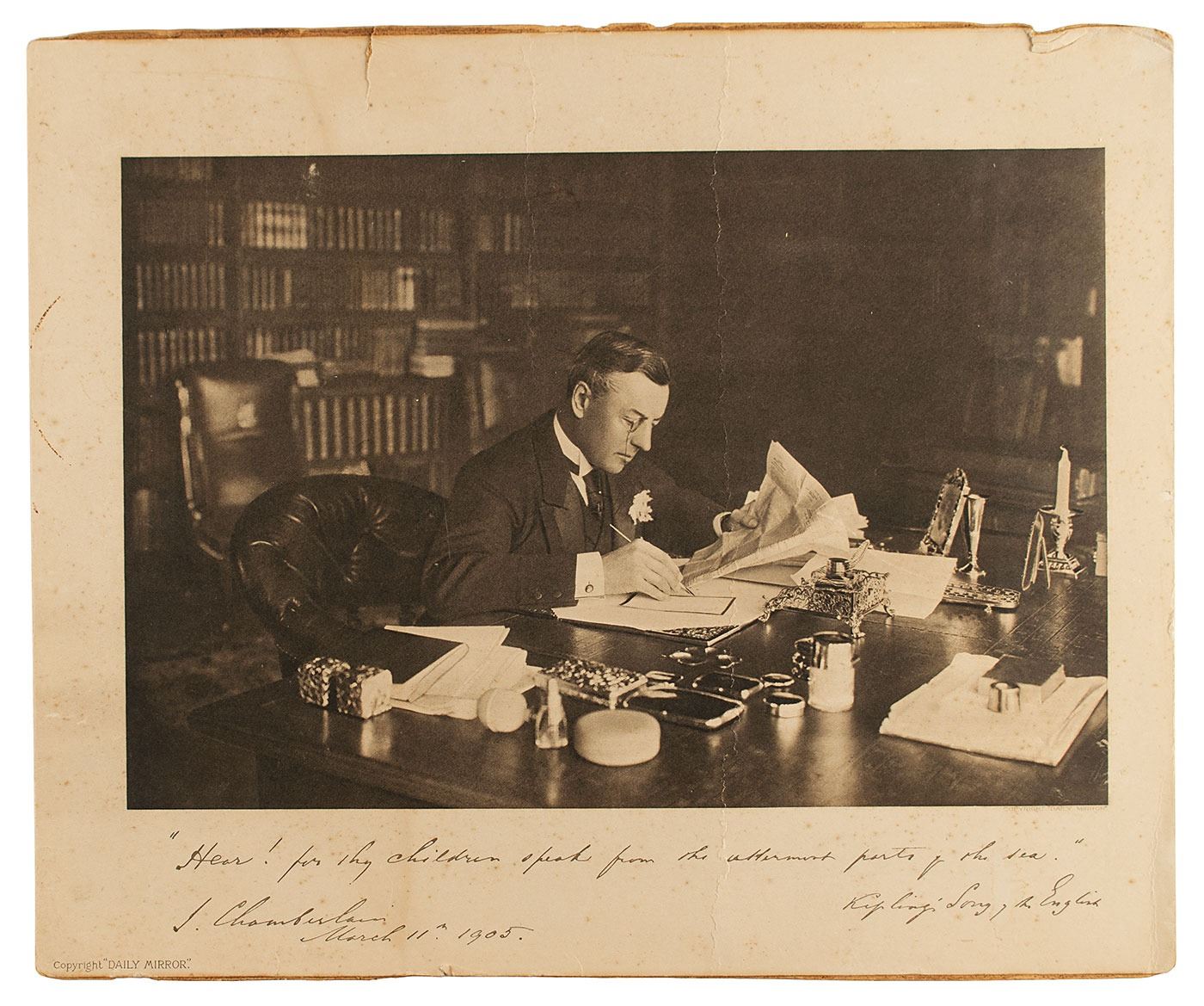 Vintage matte-finish 14 x 11.75 photo of Joseph Chamberlain working at his desk, signed in the lower border in fountain pen, "J. Chamberlain, March 33th, 1905," who adds a quote above, "'Hear! for thy children speak from the uttermost parts of the sea.' Kipling's Song of the English." Lower left bears a printed caption: "Copyright 'Daily Mirror.'" Affixed to a same-size mount. In very good condition, with a vertical crease through the image, and foxing, dinging, and a tear to the borders. A large and uncommon pose, with a particularly excellent Kipling quote.