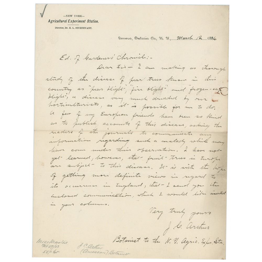 Pioneering American plant pathologist and mycologist (1850–1942) best known for his work with the parasitic rust fungi. ALS signed “J. C. Arthur, Botanist to the N. Y. Agric. Exper. Sta.,†one page, 8.5 x 11, New York Agricultural Experiment Station letterhead, March 12, 1886. Handwritten letter to the editor of Gardener's Chronicle, in part: "I am making as thorough study of diseases of pear trees known in this country as 'pear blight,' 'fire blight' and 'frozen-sap blight,' a disease very much dreaded by our horticulturists, as it is possible for me to do. A few of my European friends have been so kind as to publish accounts of this disease, asking the readers of the journals to communicate any information regarding such a malady which may have come under their observation. I have not yet learned, however, that fruit-trees in Europe are subject to this disease." In fine condition.
