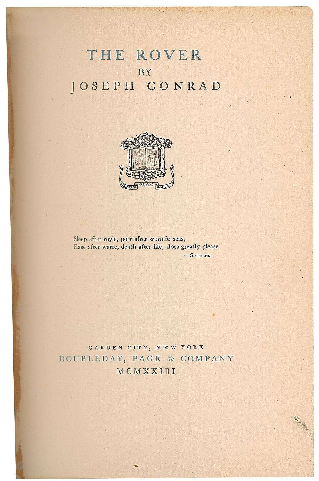 Signed book: The Rover. First edition, limited issue, numbered 171/377. Garden City, NY: Doubleday, Page & Company, 1923. Hardcover with custom slipcase, 6 x 9, 371 pages. Boldly signed on the colophon in fountain pen, "Joseph Conrad." Autographic condition: fine. Book condition: VG-/None in a VG slipcase, with soiling to boards, wear and slight splitting to spine head, and frontispiece portrait detached but present. Accompanied by a small unsigned trade edition of the book in good condition.