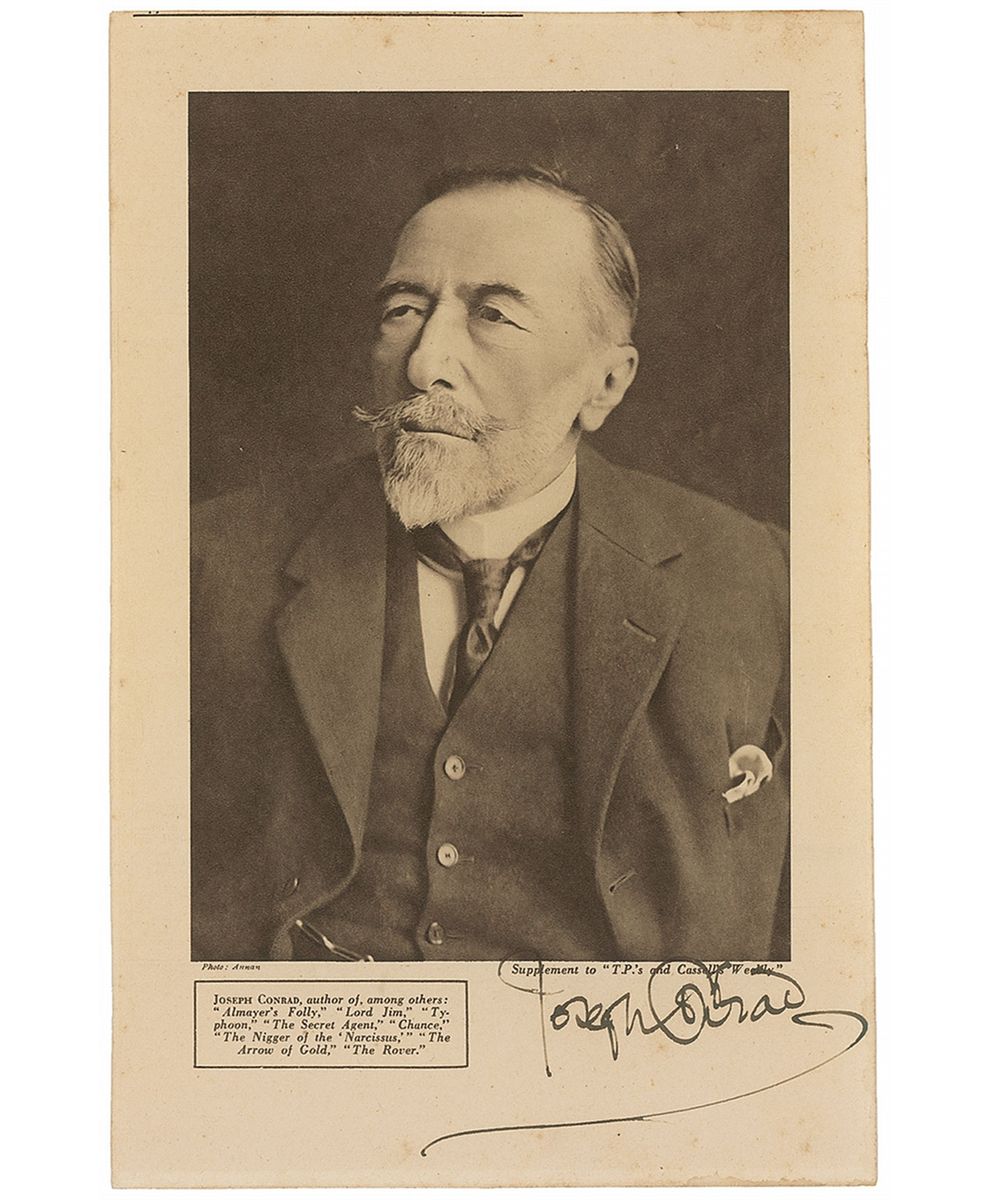 Rare vintage 7 x 10.75 photo supplement from the T.P.'s and Cassell's Weekly periodical, boldly signed in the lower border in black ink. Affixed to a same-size cardstock sheet. In fine condition, with some subtle scattered soiling and slightly trimmed edges. This is just the second Conrad signed photo we have ever offered, and the first in over a decade.