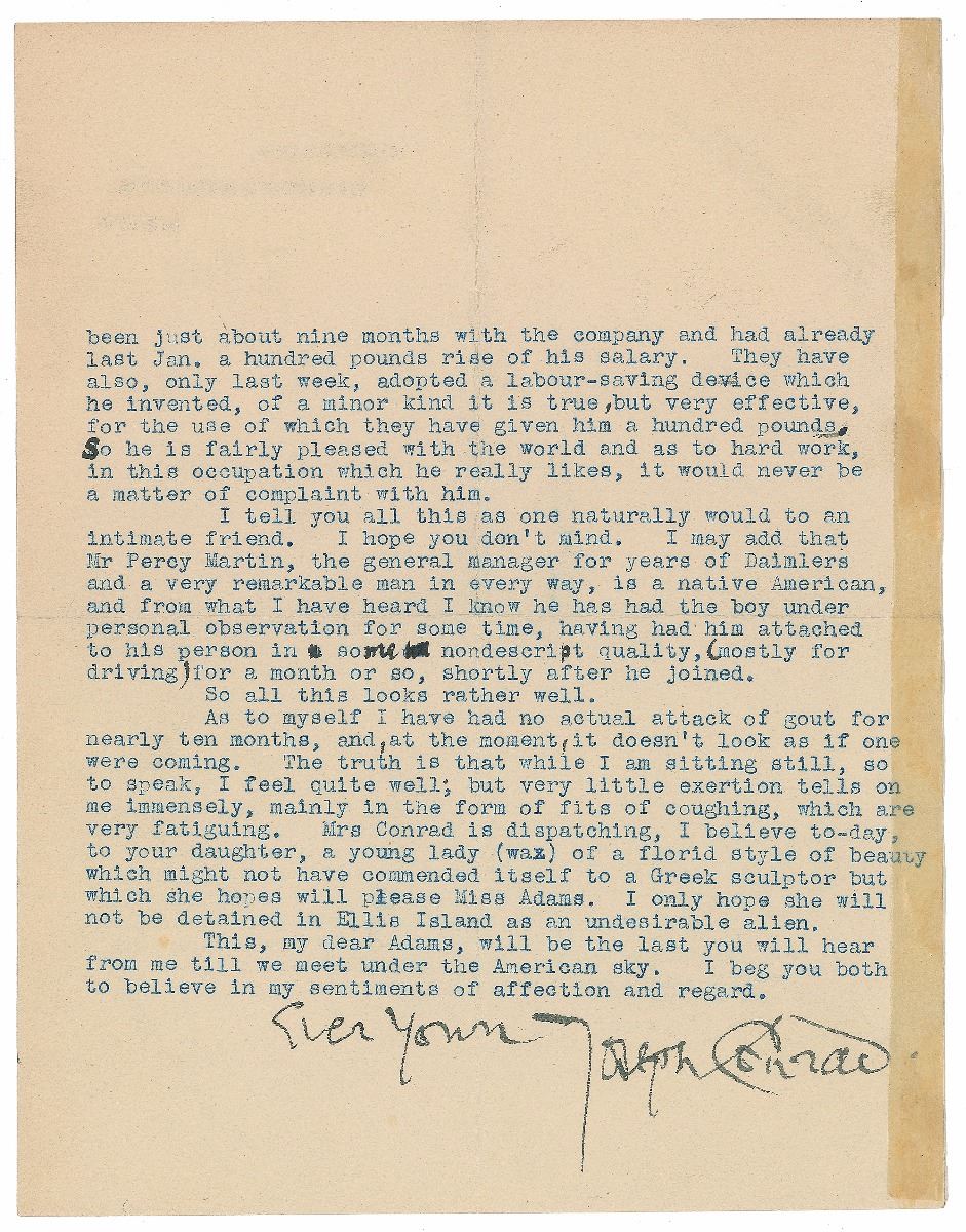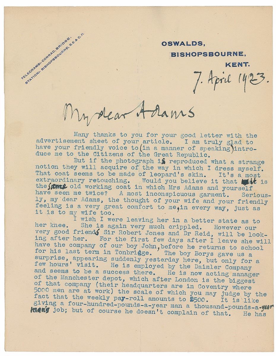 TLS signed “Ever yours, Joseph Conrad,” one page both sides, 7 x 9, Oswalds, Bishopsbourne letterhead, April 7, 1923. Letter to his friend and biographer Elbridge L. Adams, in part: “Many thanks to you for your good letter with the advertisement sheet of your article. I am truly glad to have your friendly voice to (in a manner of speaking) introduce me to the Citizens of the Great Republic…As to myself I have had no actual attack of gout for nearly ten months, and, at the moment, it doesn’t look as if one were coming. The truth is that while I am sitting still, so to speak, I feel quite well; but very little exertion tells on me immensely, mainly in the form of fits of coughing, which are very fatiguing…This, my dear Adams, will be the last you will hear from me till we meet under the American sky. I beg you both to believe in my sentiments of affection and regard.” Conrad has handwritten the date and salutation, and makes several handwritten emendations to the text. In fine condition, with central vertical and horizontal folds, and a toned strip of tape to right edge of reverse (covering a few words of text and touching the extreme tip of the signature).