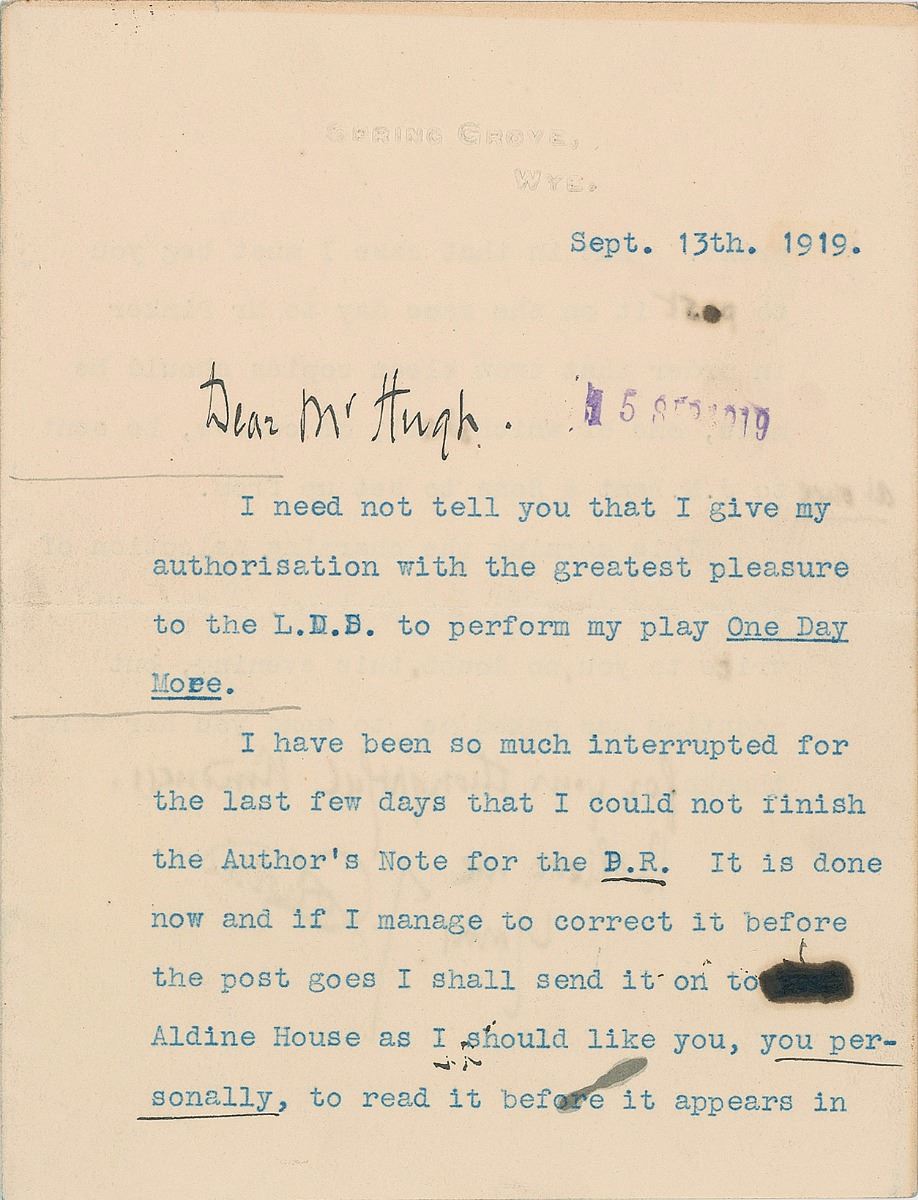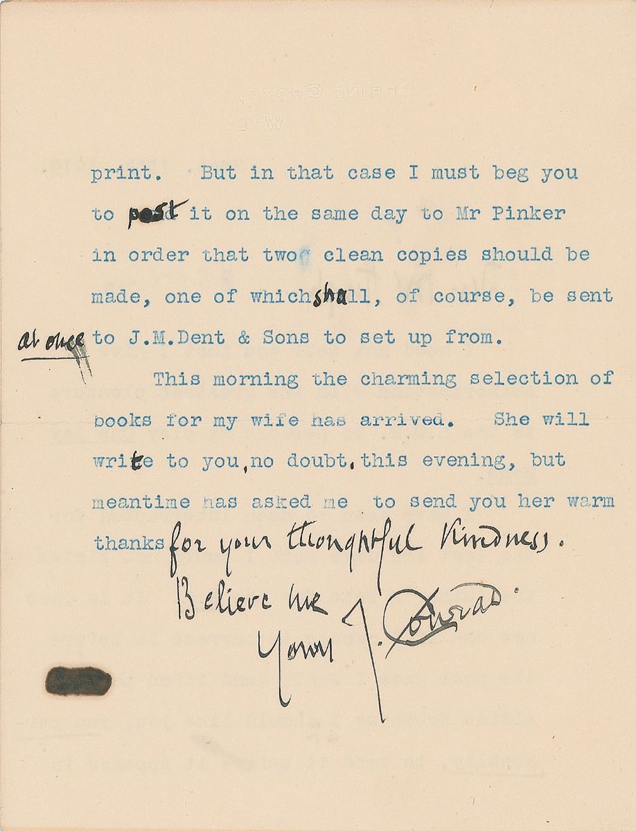 TLS signed “for your thoughtful kindness, Believe me, Yours J. Conrad,” one page both sides, 5.25 x 6.75, Spring Grove letterhead, September 13, 1919. Letter to Mr. Hugh, in full: “I need not tell you that I give my authorisation with the greatest pleasure to the L. D. S. to perform my play One Day More. I have been so much interrupted for the last few days that I could not finish the Author’s Note for the D. R. It is done now and if I manage to correct it before the post goes I shall send it on to Aldine House as I should like you, you personally, to read it before it appears in print. But in that case I must beg you to post it on the same day to Mr. Pinker in order that two clean copies should be made, one of which shall, of course, be sent at once to J. M. Dent & Sons to set up from. This morning the charming selection of books for my wife has arrived. She will write to you, no doubt, this evening, but meantime has asked me to send you her warm thanks.” Conrad has added a handwritten salutation, and adds several handwritten emendations to the text. In fine condition.