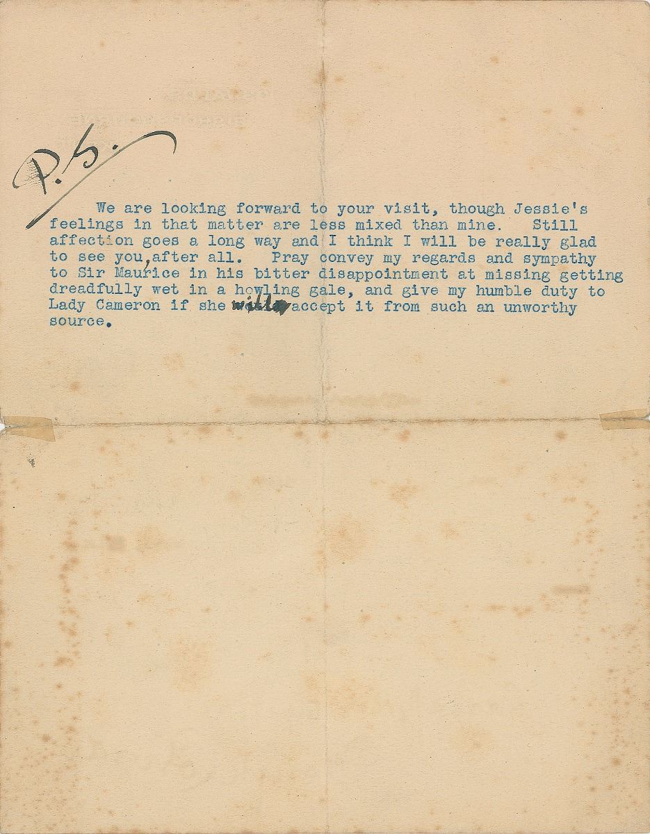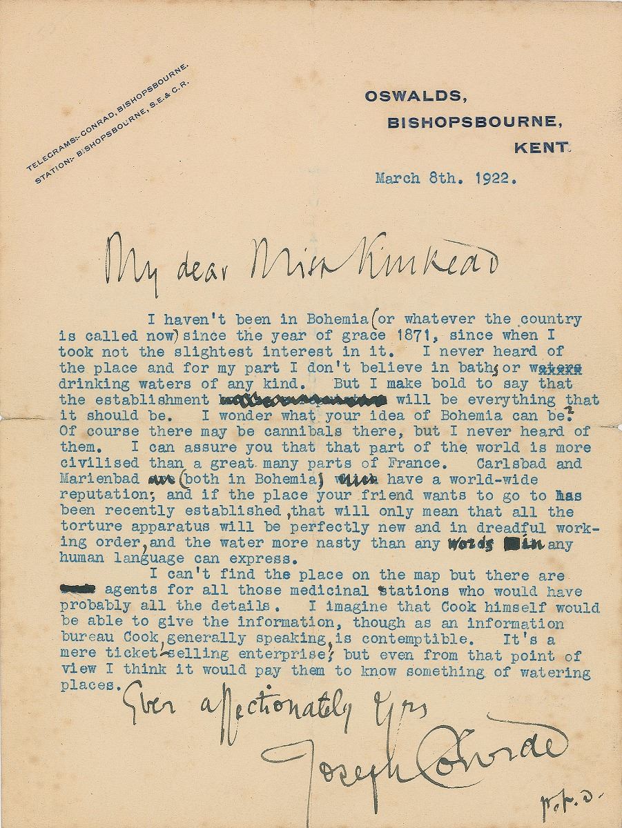 TLS signed “Ever affectionally yours, Joseph Conrad,” one page both sides, 7 x 9, Oswald Bishopsbourne letterhead, March 8, 1922. Letter to Irish artist Alice Sarah Kinkead, in full: “I haven’t been in Bohemia (or whatever the country is called now) since the year of grace 1871, since when I took not the slightest interest in it. I never heard of the place and for my part I don’t believe in baths or drinking waters of any kind. But I make bold to say that the establishment will be everything that it should be. I wonder what your idea of Bohemia can be? Of course there may be cannibals there, but I never heard of them. I can assure you that that part of the world is more civilised than a great many parts of France. Carlsbad and Marienbad (both in Bohemia) have a world-wide reputation; and if the place your friend wants to go to has been recently established, that will only mean that all the torture apparatus will be perfectly new and in dreadful working order, and the water more nasty than any words in any human language can express. I can’t find the place on the map but there are agents for all those medicinal stations who would have probably all the details. I imagine that Cook himself would be able to give the information, though as an information bureau Cook generally speaking is contemptible. It’s a mere ticket ‘selling enterprise,’ but even from that point if view I think it would pay them to know something of watering places.” Conrad adds a postscript to the reverse, handwriting the initials “P. S.,” in full: “We are looking forward to your visit, though Jessie’s feelings on that matter are less mixed than mine. Still affection goes a long way and I think I will be really glad to see you, after all. Pray convey my regards and sympathy to Sir Maurice in his bitter disappointment at missing getting dreadfully wet in a howling gale, and give my humble duty to Lady Cameron if she will accept it from such an unworthy source.” Conrad has added a handwritten salutation and several handwritten emendations. In fine condition, with two tape repairs to central vertical and horizontal folds. Kinkead befriended Conrad during a trip to Corsica in 1921, and in April 1924, four months before the writer’s death, she painted what would become his final portrait.
