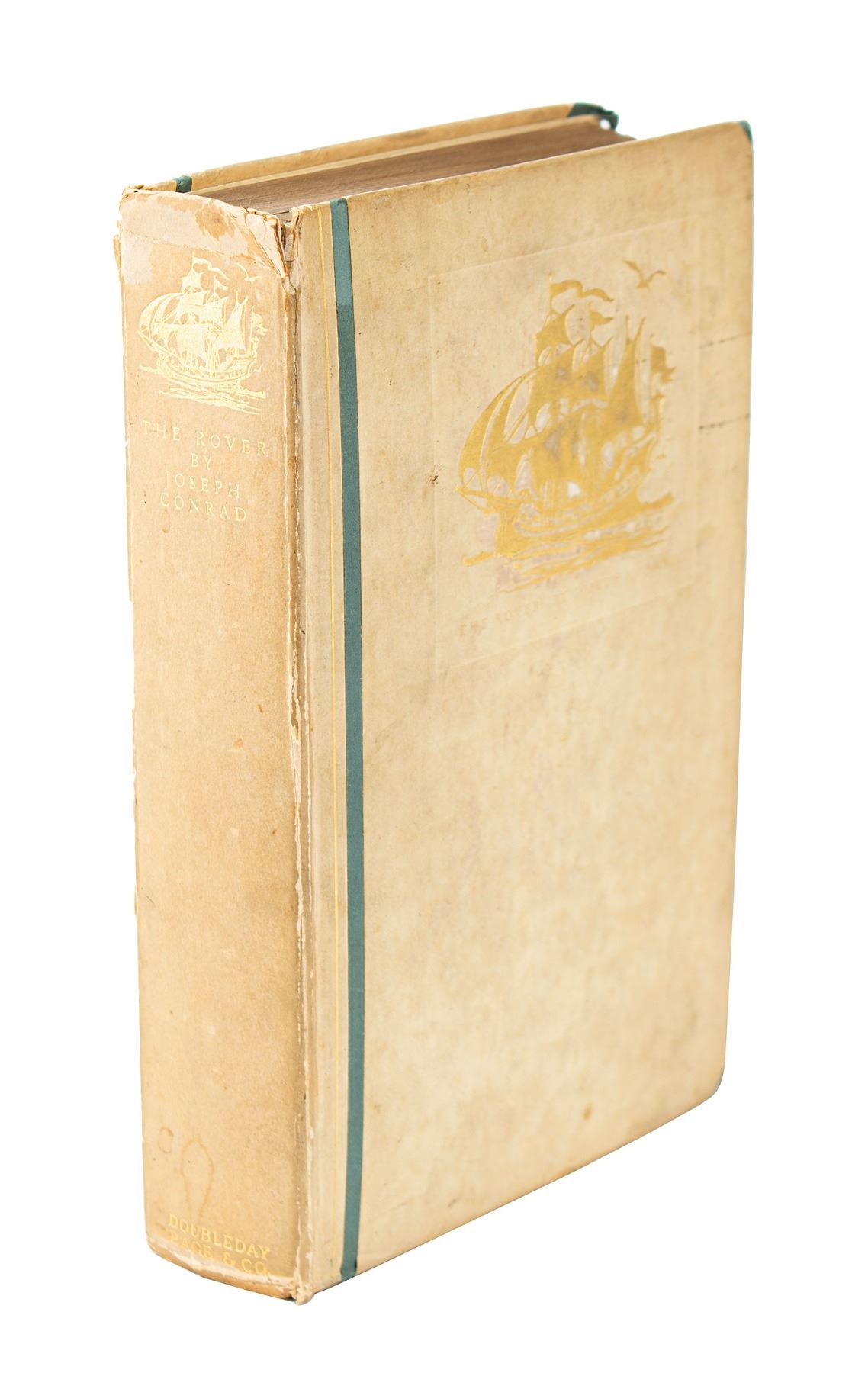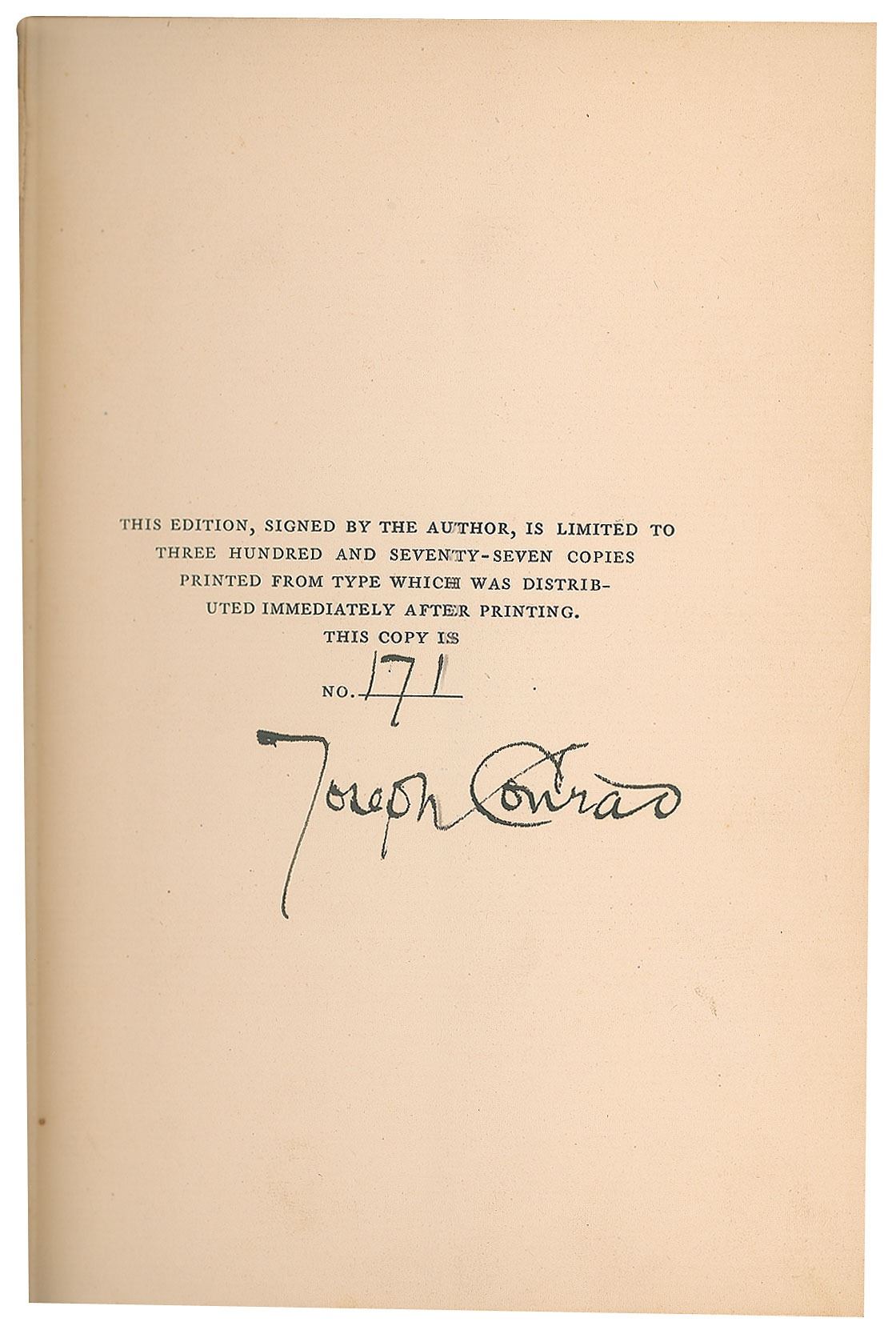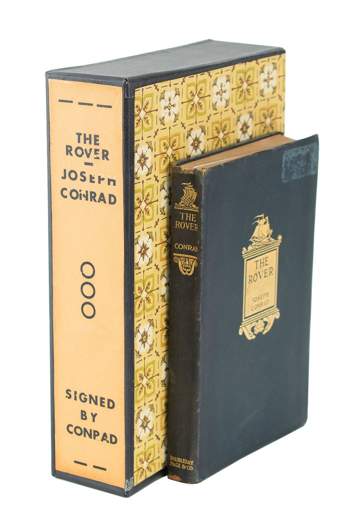Signed book: The Rover. First edition, limited issue, numbered 171/377. Garden City, NY: Doubleday, Page & Company, 1923. Hardcover with custom slipcase, 6 x 9, 371 pages. Boldly signed on the colophon in fountain pen, "Joseph Conrad." Autographic condition: fine. Book condition: VG-/None in a VG slipcase, with soiling to boards, wear and slight splitting to spine head, and frontispiece portrait detached but present. Accompanied by a small unsigned trade edition of the book in good condition.