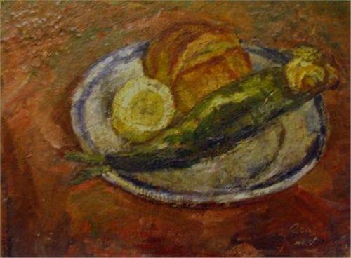 Joseph Constant, 1892 - 1969, Still Life with a Fish, Oil on cardboard, 27x35 cm, Signed and dated 1930., , , , ,