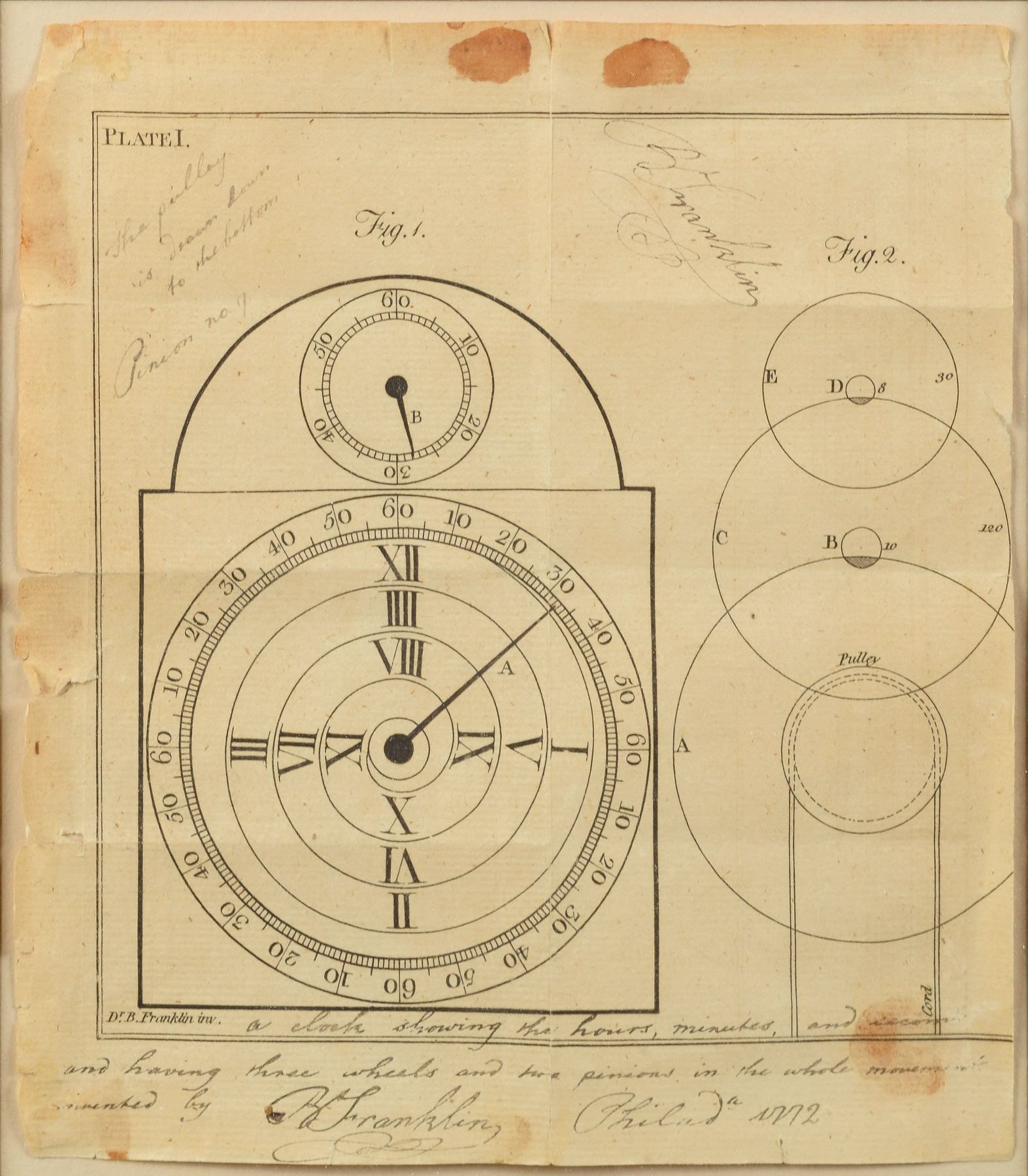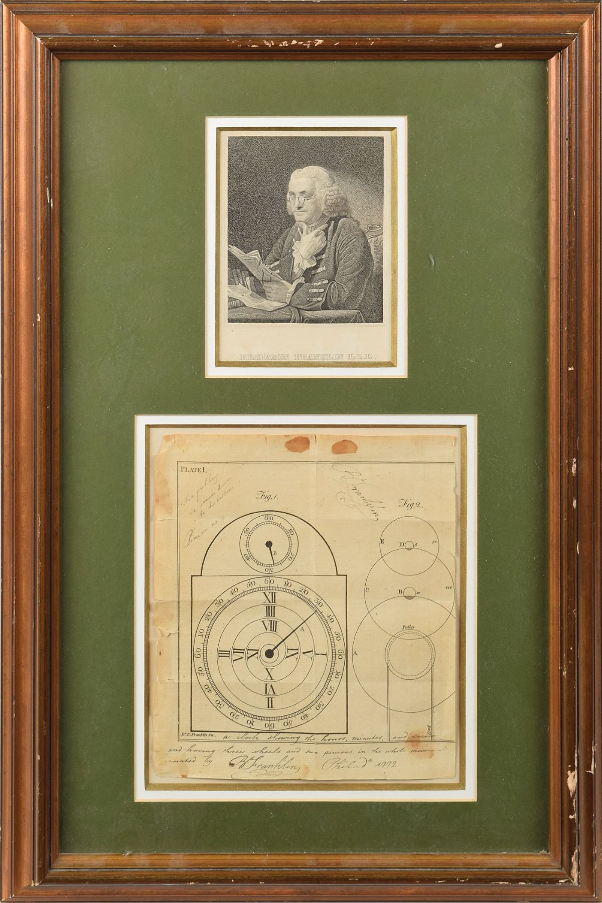 American forger (1887–1950?) who forged letters from American luminaries. Unusual engraving of a clock bearing two Joseph Cosey forgeries of Franklin's signature, one page, 7 x 8, described in the lower margin, "A clock showing the hours, minutes, and second and having three wheels and pinions in the whole movement, invented by B. Franklin, Philad'a 1772." The document is also signed at the top, "B. Franklin." Impressively mounted, double-matted, and framed with an engraved portrait to an overall size of 14 x 21. In very good to fine condition, with stains and edge tears.