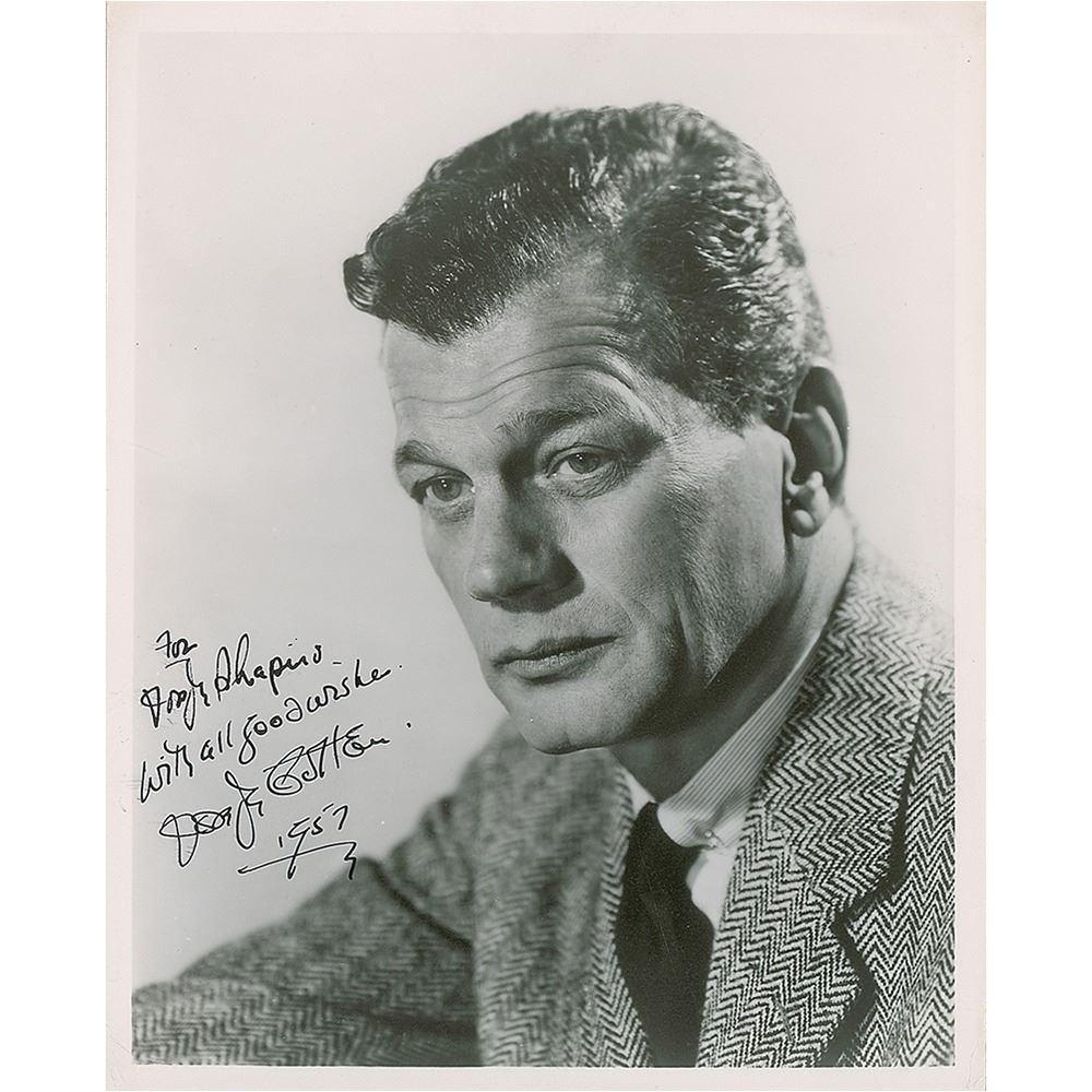 Vintage matte-finish 8 x 10 close-up photo of the Citizen Kane actor, signed and inscribed in fountain pen, "For Joseph Shapiro, with all good wishes, Joseph Cotten, 1957.” In fine condition.