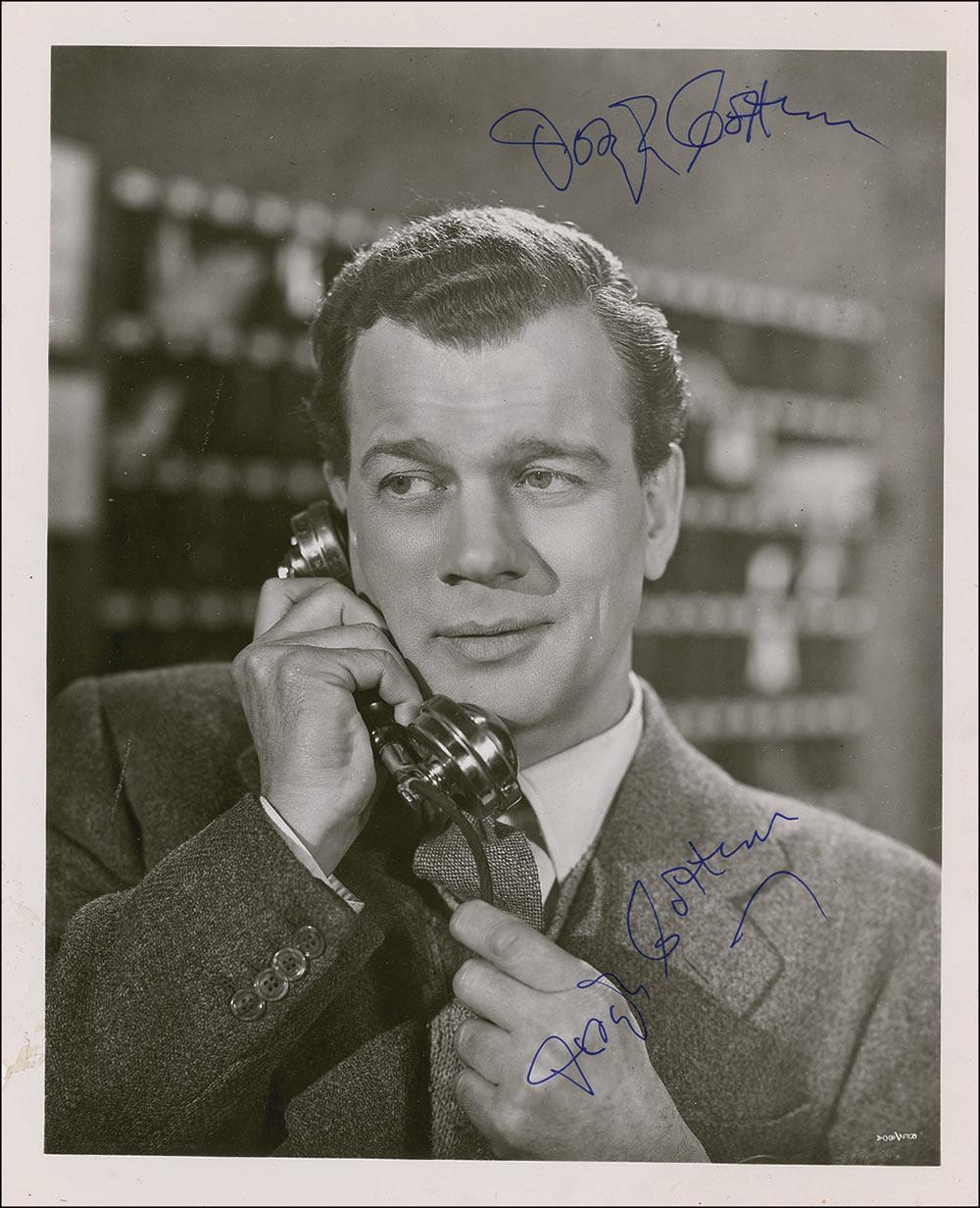 Glossy 8 x 10 photo of Cotten talking on the phone in one of his films, signed twice in fountain pen. In fine condition, with a few scattered light creases impressions, and surface marks.