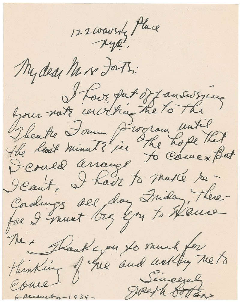 ALS, one page, 6 x 7.75, December 6, 1939. Cotten declines an invitation. In part: “I have put off answering your note inviting me to the Theatre Forum program…in the hope that I could arrange to come. But I can’t.” In fine condition, with light scattered creases.