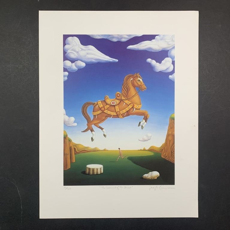 Joseph Cusimano's "The Carousel of the Mind" limited edition print, signed lower right, numbered 83/350 lower left, and titled lower middle. This piece is a horse from a carousel, flying the air, with a man running underneath. This piece is in near excellent condition with minor soiling at right.