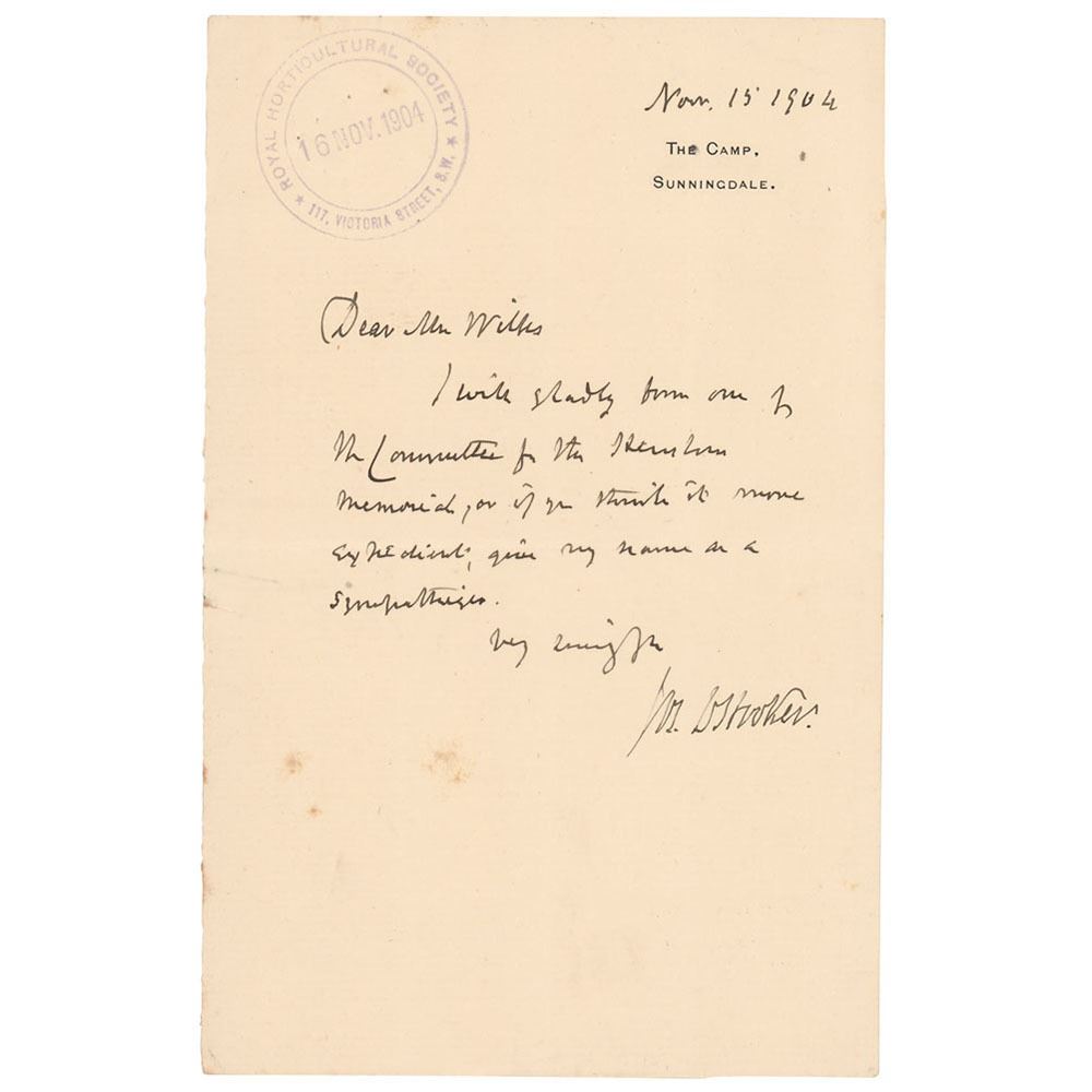 LS signed “Jos. D. Hooker,†one page, 4.5 x 7, The Camp, Sunningdale letterhead, November 15, 1904. Letter to William Wilks, secretary of the Royal Horticultural Society, in part: "I will gladly from one of the Committee for the…memorial, or if you think it more expedient, give my name as a sympathizer." In fine condition, with a few trivial stains.