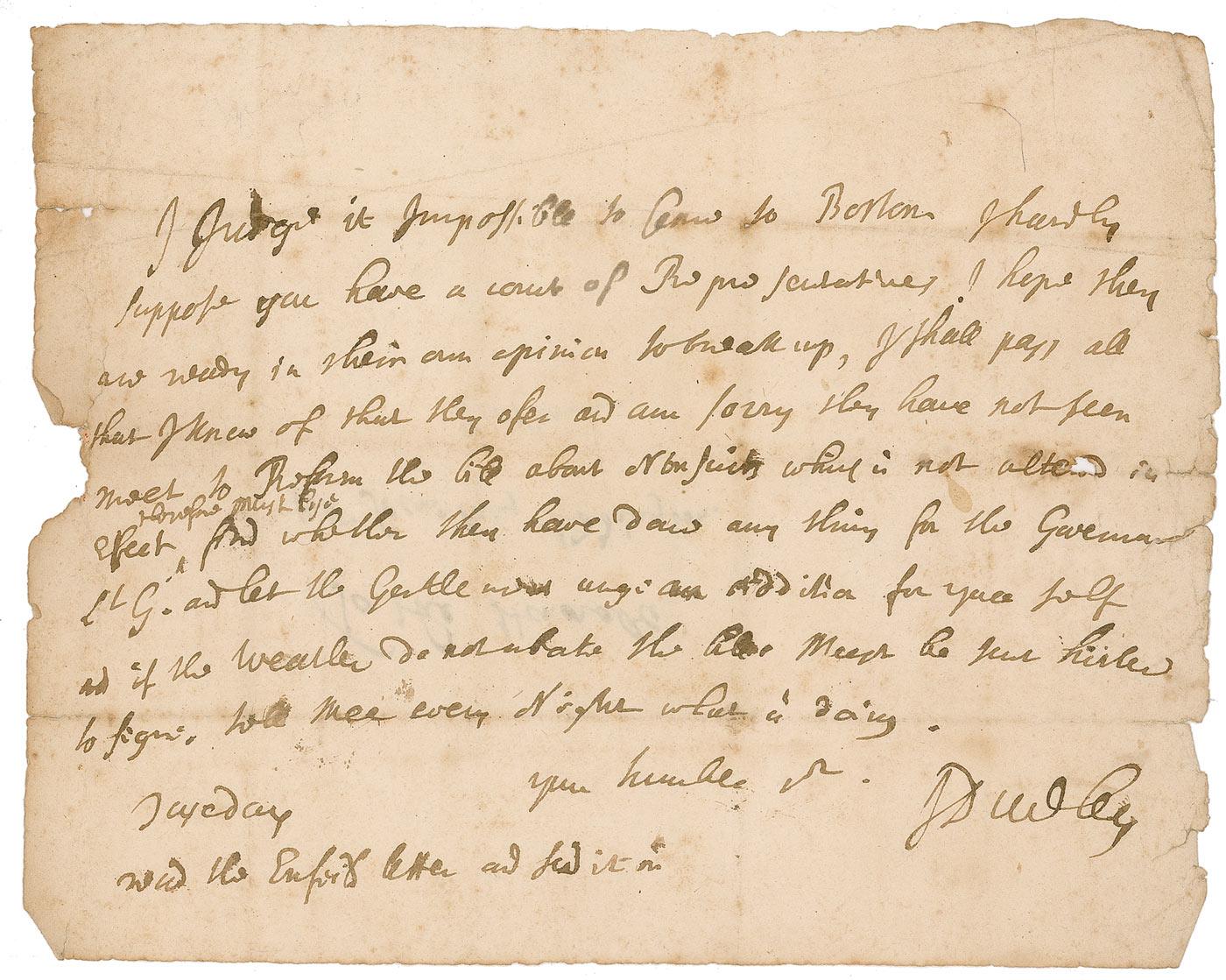 Colonial governor of Massachusetts from 1702 to 1715. ALS signed “Dudley,” one page, 8 x 6, no date. Letter to the Honorable Secretary Addington of Boston. In part, "I judge it impossible to come to Boston. I hardly suppose you have a count of Representatives. I hope they are ready in their own opinion to break up, I shall pass all that I knew of thus they…and am sorry they have not been…to reform the life about N. Brunswick which is not altered in effort…addition for your self and if the weather do not…every night what a day.” Reverse bears an address panel in Dudley’s hand. In very good condition, with scattered foxing and soiling, small edge tears and creases, trivial areas of paper loss to left edge, a couple small holes to page and intersecting folds. A scarce offering from long before the American Revolution.