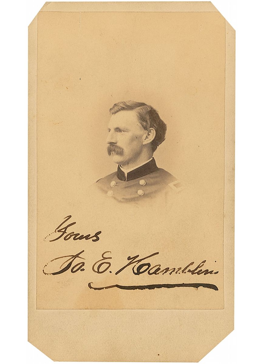 Union officer (1828–1870) who was breveted twice for his actions at Cedar Creek and Sailor’s Creek. Original 2.25 x 4 carte-de-visite photo by A. Lonrel of Boston, signed below the image in black ink, “yours, Jo. E. Hamblin.” Clipped corner tips and a revenue stamp affixed to reverse, otherwise fine condition.