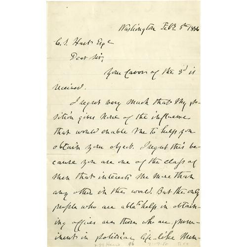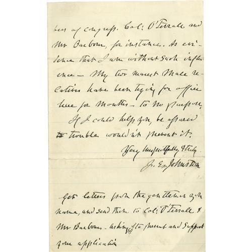 <B>Joseph E. Johnston Autograph Letter Signed</B></I> "<I>J.E. Johnston.</B></I>" Two pages, 5" x 8", Washington D.C., February 5, 1886. The letter is written to a C.S. Hart Esq., it explains Johnston's regret that he is unable to help Hart run for political office. Joseph E. Johnston was one of the most senior generals for the Confederacy during the Civil War, and after the war ended he served as Commissioner of Railroads under Grover Cleveland. <BR><BR>The letter is in very good condition; slightly soiled on the edges; usual folds are present; separation occurring on the vertical fold. From the Henry E. Luhrs Collection. Accompanied by LOA from PSA/DNA.