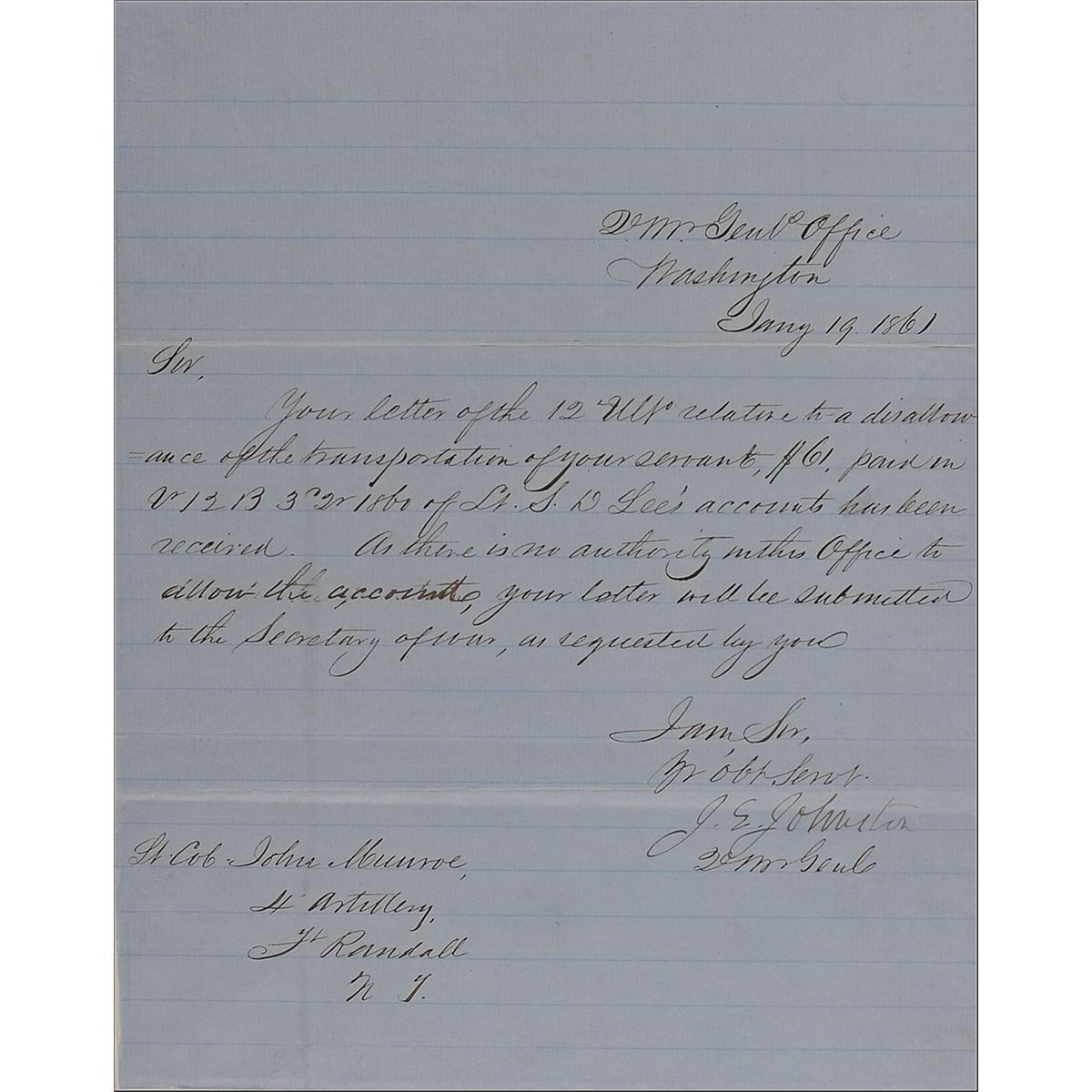 Confederate general (1807–1891) who, when Virginia seceded from the Union in 1861, resigned his commission as a brigadier general in the regular army—the highest-ranking US officer to do so. Initially commissioned as a major general in the Virginia militia, he relieved ‘Stonewall’ Jackson’s command at Harper’s Ferry and organized the Army of the Shenandoah. LS signed “J. E. Johnston,” one page, lightly-lined, 7.5 x 9.25, January 19, 1861. Letter to Lieutenant Colonel John Monroe. In part: “Your letter of the 12th Ulto relative to a disallowance of the transportation of your servant, $61 paid…of Lt. S. D. Lee’s accounts has been received. As there is no authorization in this Office to allow the accounts, your letter will be submitted to the Secretary of War, as requested by you.” Letter is affixed to a slightly larger off-white sheet and framed to an overall size of 11 x 13.5. In fine condition, with scattered light creasing and wrinkling.