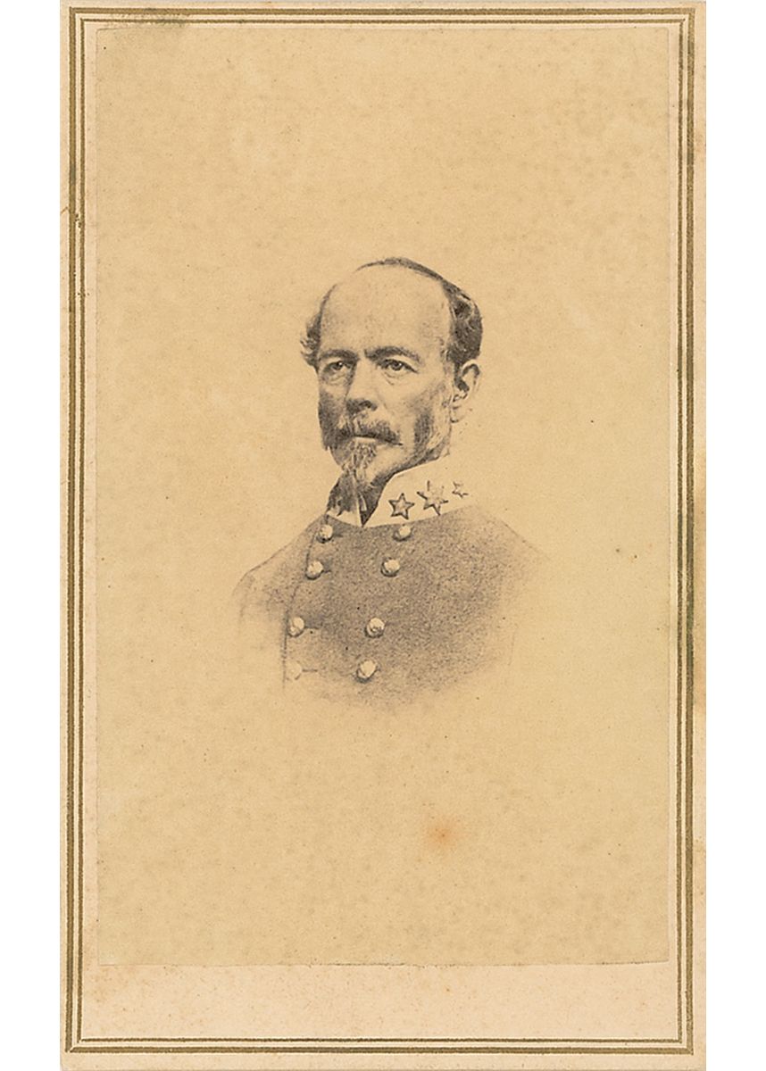 Confederate general (1807–1891) who, when Virginia seceded from the Union in 1861, resigned his commission as a brigadier general in the regular army—the highest-ranking US officer to do so. Unsigned original 2.25 x 4 carte-de-visite bust portrait of Johnston in uniform by E. & H. T. Anthony of New York. Scattered spotting and slight foxing to image, and a two-cent revenue stamp affixed to reverse, otherwise fine condition.