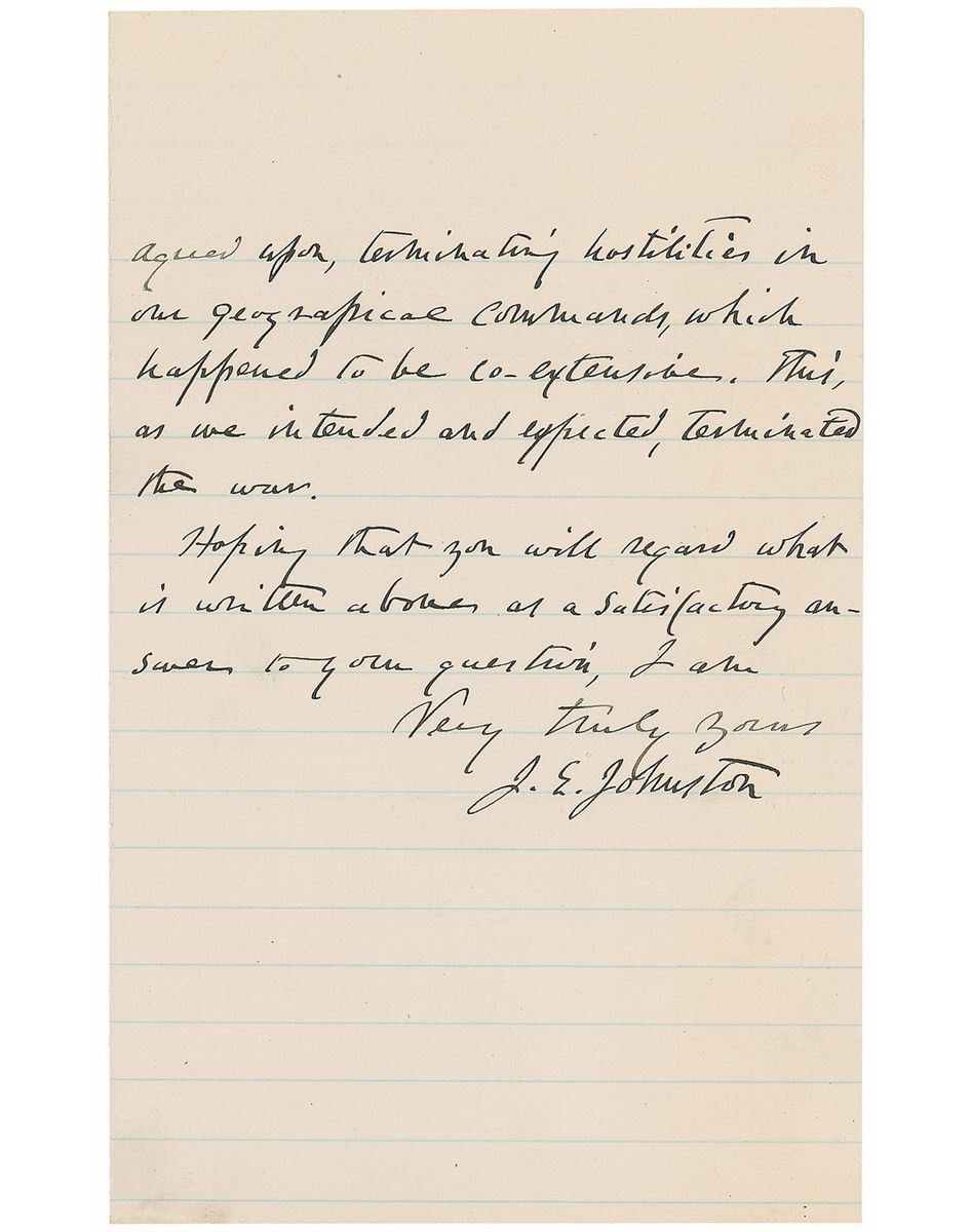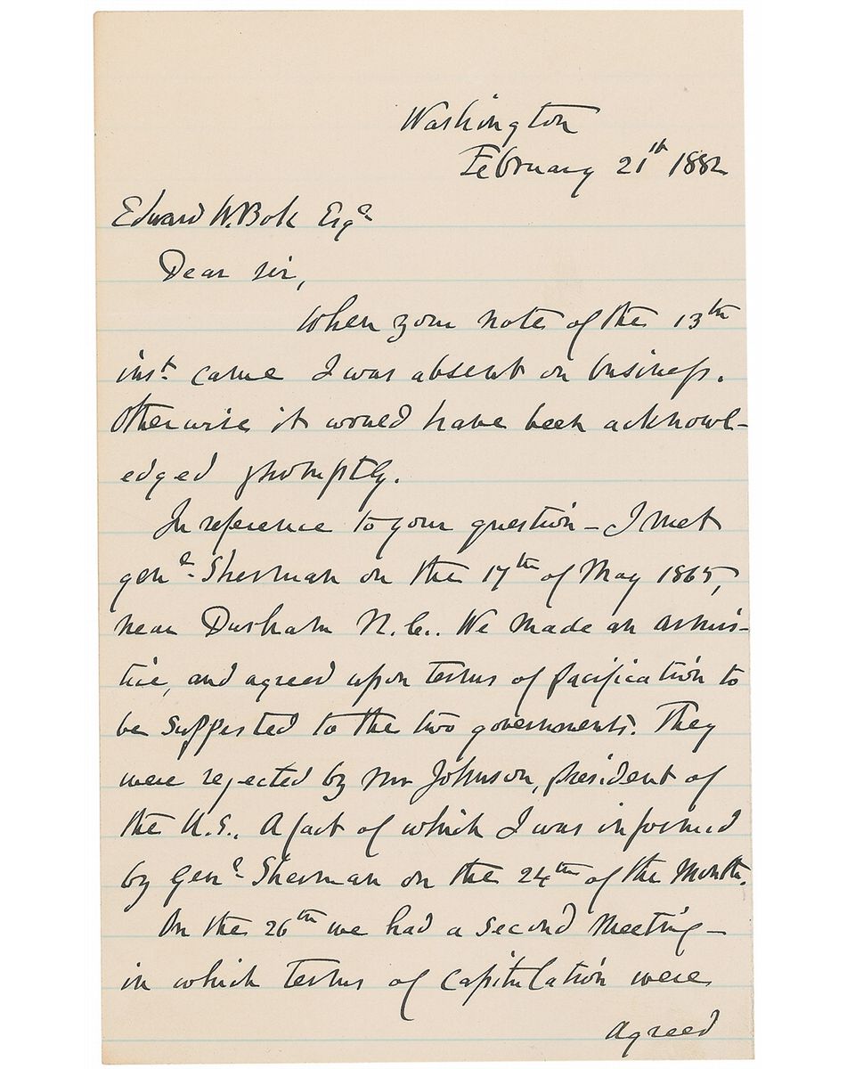 Confederate general (1807–1891) who, when Virginia seceded from the Union in 1861, resigned his commission as a brigadier general in the regular army—the highest-ranking US officer to do so. Choice, boldly-penned ALS signed “J. E. Johnston,” two pages, lightly-lined on two adjoining sheets, 5 x 8, February 21, 1882. Letter to magazine editor and future Pulitzer Prize–winning author Edward W. Bok. In part: “In reference to your question—I met Gen. Sherman on the 17th of May 1865, near Durham N. C. We made an armistice and agreed upon terms of pacification to be suggested to the two governments. They were rejected by Mr. Johnson, President of the U. S., a fact of which I was informed by Gen. Sherman on the 24th of the Month. On the 26th we had a second meeting—in which terms of capitulation were agreed agreed [sic] upon, terminating hostilities in our geograpical [sic] commands, which happened to be co-extensive. This, as we intended and expected, terminated the war.” In fine to very fine condition.