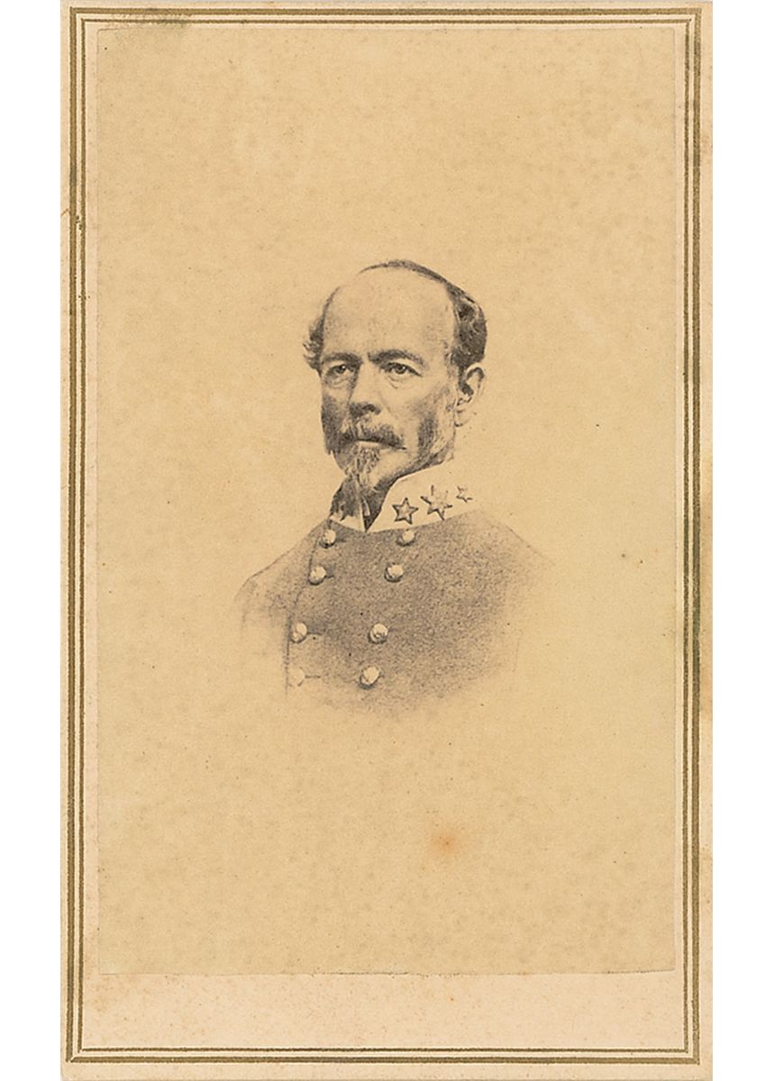 Confederate general (1807–1891) who, when Virginia seceded from the Union in 1861, resigned his commission as a brigadier general in the regular army—the highest-ranking US officer to do so. Unsigned original 2.25 x 4 carte-de-visite bust portrait of Johnston in uniform by E. & H. T. Anthony of New York. Scattered spotting and slight foxing to image, and a two-cent revenue stamp affixed to reverse, otherwise fine condition.
