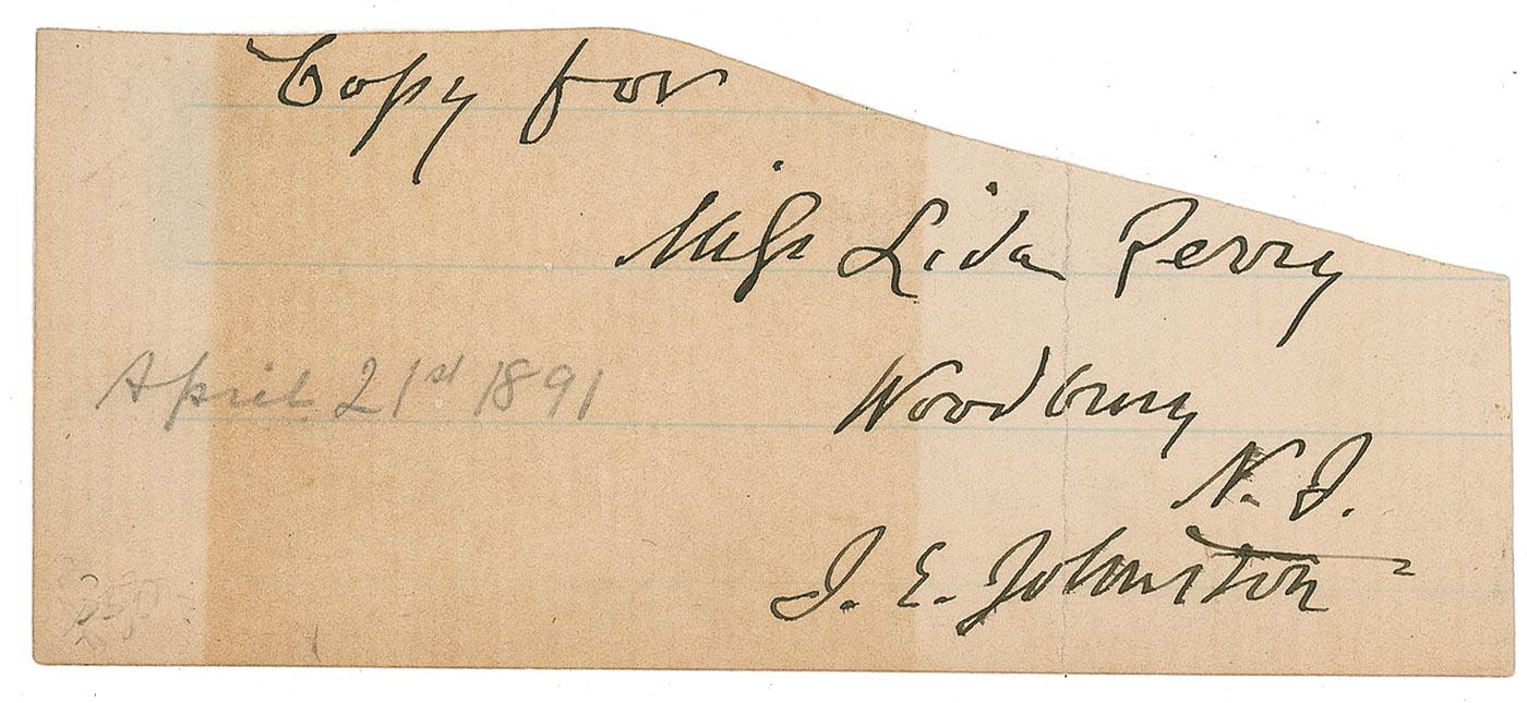 Ink signature and sentiment, “Copy for Miss Lila Perry, Woodbury, N.J. J. E. Johnston,” on an off-white 4.75 x 2 lightly-lined slip. In very good condition, with cut top right corner, block of even toning touching his first two initials, a vertical fold passing through his name, and the date “April 21st, 1891” written in pencil in an unknown hand.