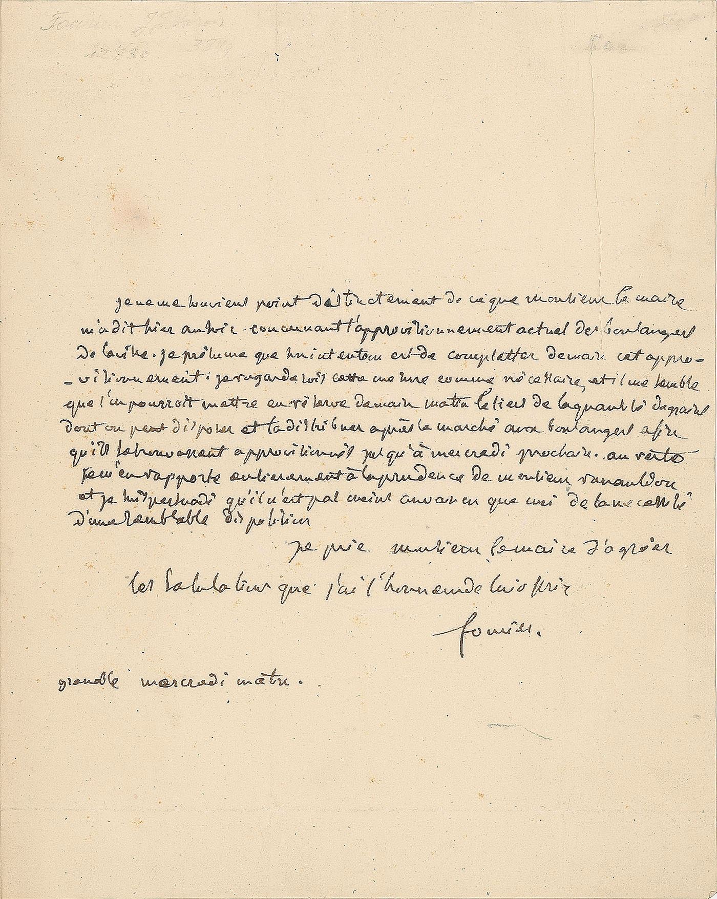 ALS in French, signed “Fourier,” one page, 7.5 x 9.25, no date. Untranslated letter to the mayor of Grenoble. Addressed on the integral address leaf in Fourier's hand. In fine condition, with seal-related paper loss to the integral address leaf.