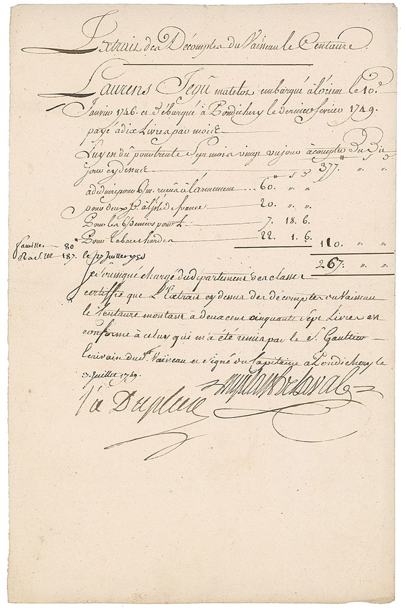 Governor general of the French establishment in India and rival of Robert Clive (1697–1763). Rare manuscript DS, in French, signed “Dupleix,” one page, 8 x 12.5, July 3, 1749, Pondichery (French capital of India). Untranslated financial document regarding the accounts of the ship "The Centaur.” In fine condition, with intersecting folds and a few mild creases.