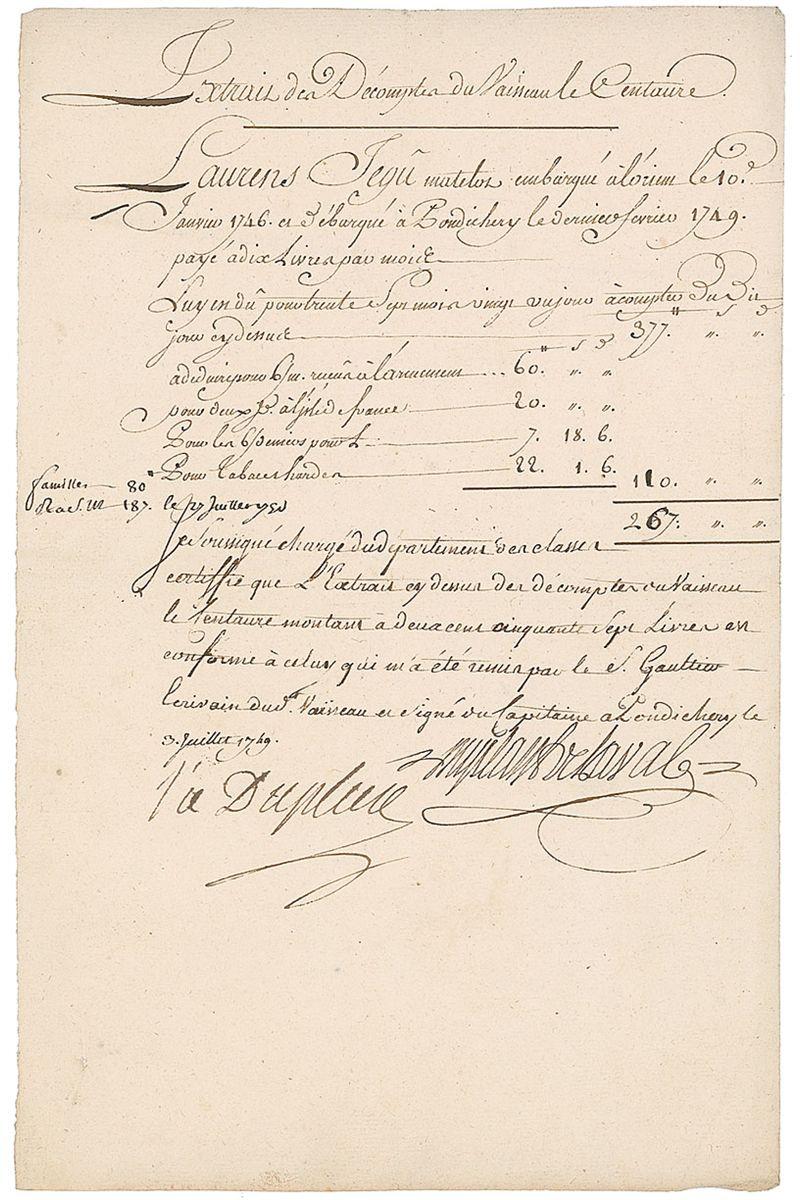 Governor general of the French establishment in India and rival of Robert Clive (1697–1763). Rare manuscript DS, in French, signed “Dupleix,” one page, 8 x 12.5, July 3, 1749, Pondichery (French capital of India). Untranslated financial document regarding the accounts of the ship “The Centaur.” In fine condition, with intersecting folds and a few mild creases.