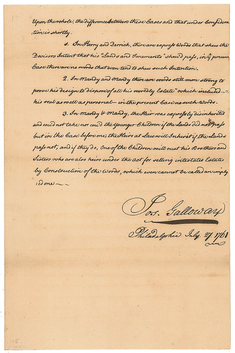 Friend of Benjamin Franklin and delegate to the First Continental Congress who later became a Loyalist and returned to Britain (1731–1803). Manuscript DS, signed “Jos. Galloway,” one page, 10.75 x 7.25, July 27, 1761. Legal document. In part: “Upon the whole, the difference between these cases and that under consideration is shortly: 1. In Kerry and Derrick, there are express words that show the devisors intent…2. In Mandy and Mandy there are words still more strong to prove his design to dispose of all his worldly estate…3. In Mandy & Mandy the heir was expressly disinherited.” Beautifully housed in an archival hardcover folder with slipcase. In fine condition.