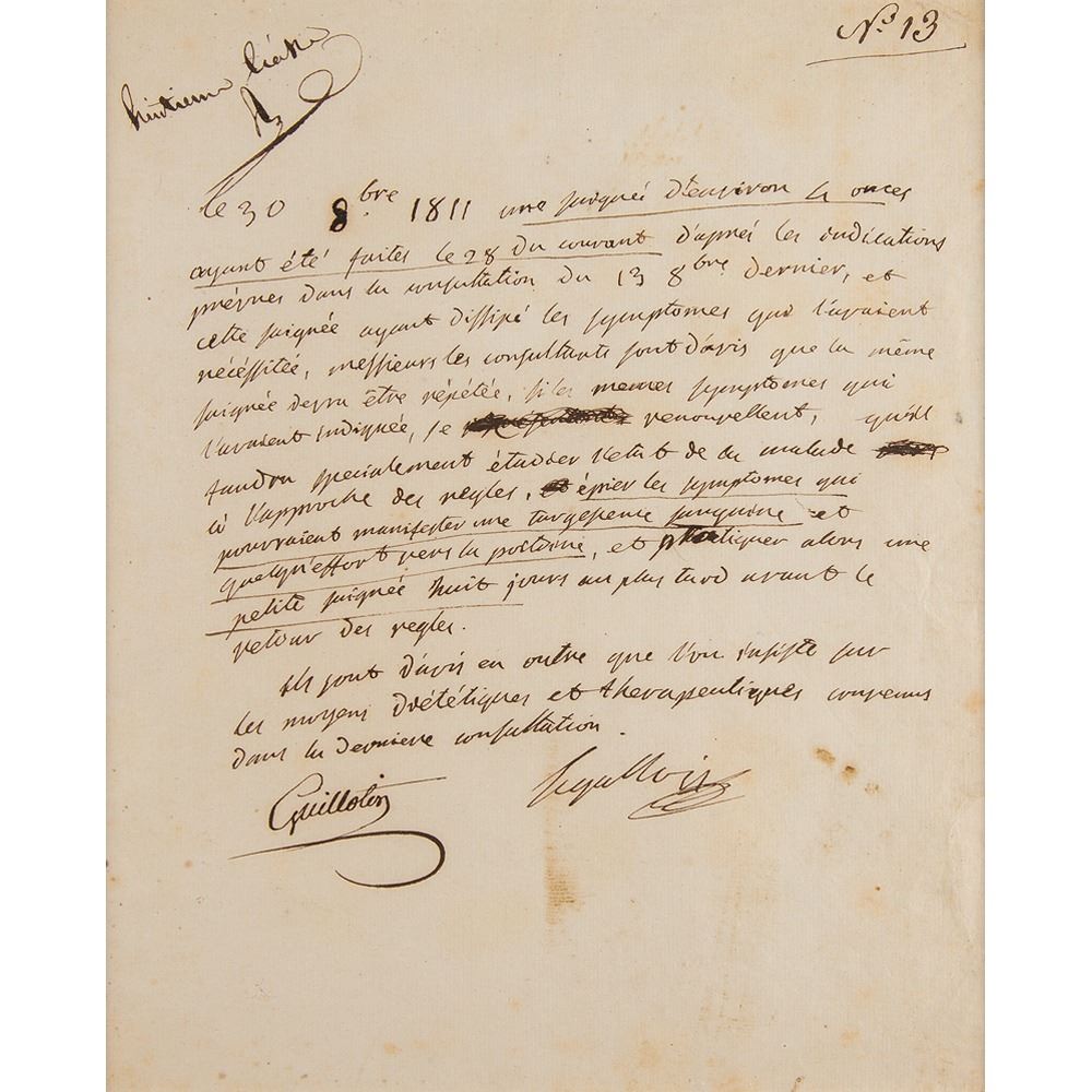 French physician and politician (1738–1814) whose name became synonymous with the 'humane' instrument of execution whose use he proposed to the government during the French Revolution. Manuscript DS in French, signed "Guillotin," one page, 7.5 x 9.5, October 30, 1811. A fascinating medical report, which reads, in part (translated): “A bloodletting of about four ounces having been done on the 28th of this month according to the directions given in the consultation of Oct. 13, and this bloodletting having dissipated the symptoms which made it necessary, the consulting doctors are of the opinion that the same bloodletting should be repeated, if the symptoms which made it necessary, reappear. It will be particularly necessary to study the patient's condition at the oncoming of her periods, to observe the symptoms which could indicate a blood turgescence and a strain to her bosom and then to undertake a small bloodletting at the latest a week before the return of her period. They are also of the opinion that the dietary and therapeutic means established during the last consultation be strictly adhered to.” Boldly signed at the conclusion by Guillotin. Archivally matted and framed with two photos and a caption to an overall size of 27 x 14.5. In fine condition, with some scattered light stains, and chips to the frame. An uncommon format with exceptional procedural content from Guillotin's many years as a trusted and well-respected physician.