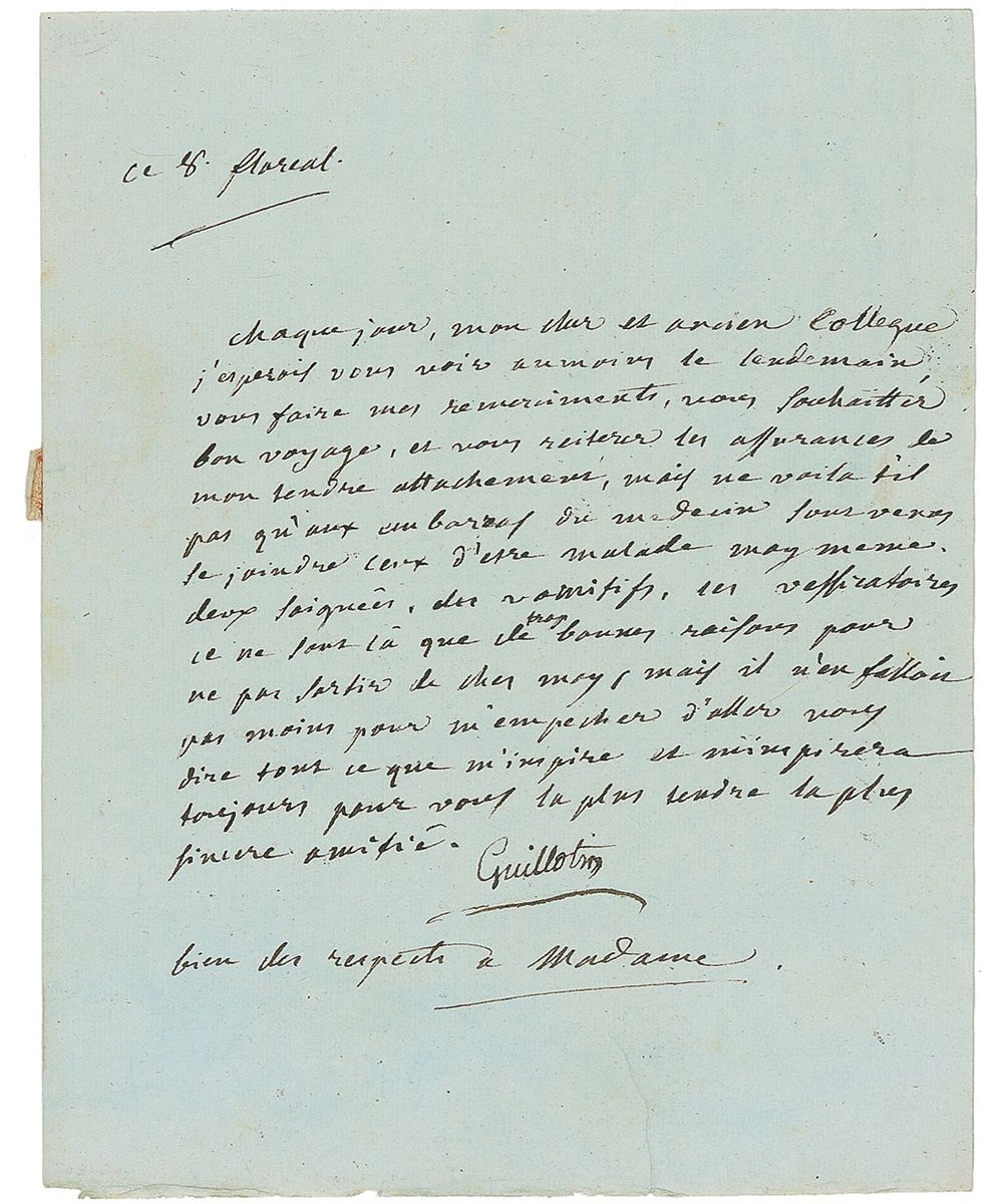 French physician and politician (1738–1814) whose name became synonymous with the ‘humane’ instrument of execution whose use he proposed to the government during the French Revolution. LS in French, signed “Guillotin,” one page, 6.5 x 8.5, no date. Letter to Senator Lemercier, saying that not only his heavy duties as a physician have prevented Guillotin from seeing the Senator but also his own illness as he had to submit himself to “two bloodlettings, vomitories and vessicatories.” Reverse of second integral page bears an address panel in another hand. In fine condition, with intersecting folds, and a small area of paper loss to second page from wax seal.