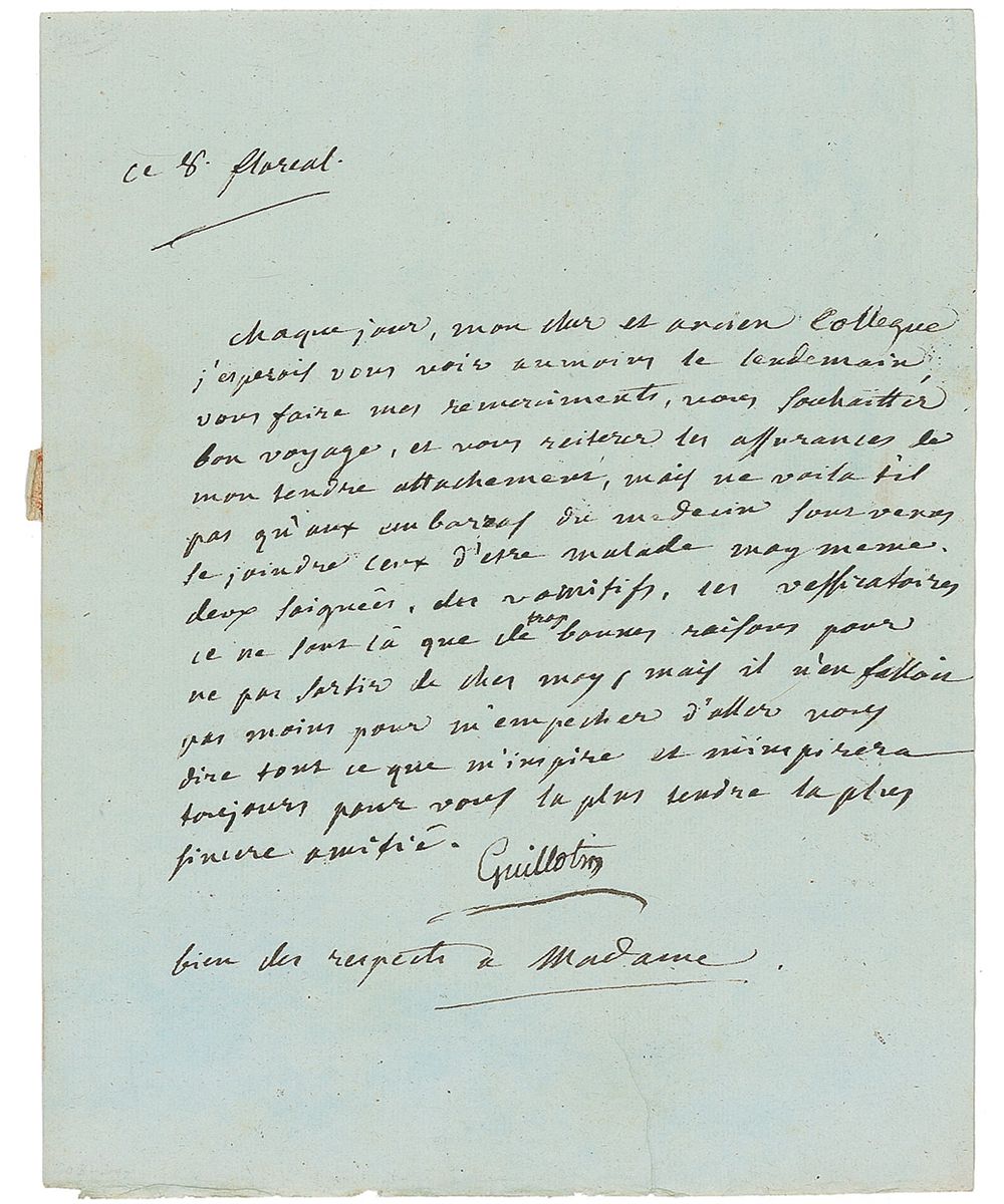 French physician and politician (1738–1814) whose name became synonymous with the ‘humane’ instrument of execution whose use he proposed to the government during the French Revolution. LS in French, signed “Guillotin,” one page, 6.5 x 8.5, no date. Letter to Senator Lemercier, saying that not only would his heavy duties as a physician prevent him from seeing the Senator, but also his own illness would, as he had to submit himself to “two bloodlettings, vomitories and vessicatories.” Reverse of second integral page bears an address panel in another hand. In fine condition, with intersecting folds, and a small area of paper loss to second page from wax seal.