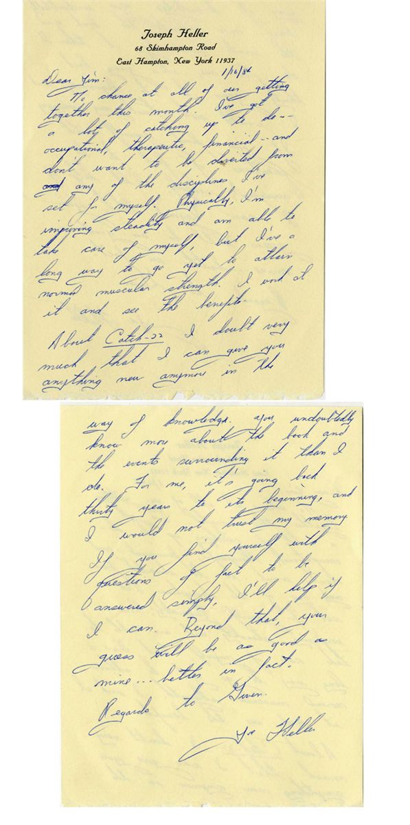 Interesting autograph letter signed by Joseph Heller, who here mentions ''Catch-22'' and his struggles recovering from Guillain-Barre syndrome. Letter dated 16 January 1984 to James Nagel reads in full, ''Dear Jim: No chance at all of our getting together this month. I've got a lot of catching up to do--occupational, therapeutic, financial--and don't want to be diverted from any of the disciplines I've set for myself. Physically, I'm improving steadily and am able to take care of myself, but I've a long way to go yet to attain normal muscular strength. I work at it and see the benefits. About Catch-22 I doubt very much that I can give you anything new anymore in the way of knowledge. You undoubtedly know more about the book and the events surrounding it than I do. For me, it's going back thirty years to its beginning, and I would not trust my memory. If you find yourself with questions of fact to be answered simply, I'll help if I can. Beyond that, your guess will be as good as mine...better in fact. Regards to Gwen. Joe Heller''. Two page letter on single sheet of Heller's personal stationery measures 5.75'' x 7.75''. Accompanied by original handwritten envelope. Near fine condition.